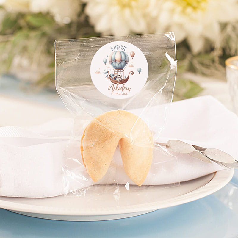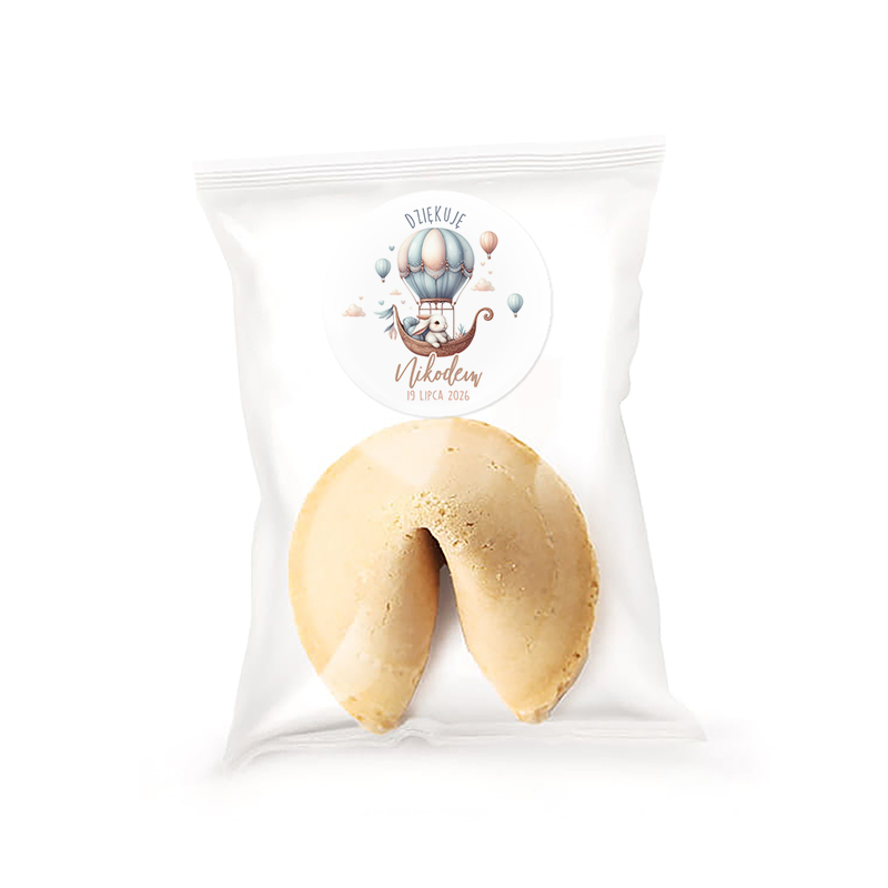 Ciasteczka dostępne są w pięciu wariantach kolorystycznych: klasycznym biszkoptowym, niebieskim, zielonym, czekoladowym oraz różowym. Dzięki temu łatwo dopasować je do motywu przewodniego przyjęcia lub płci dziecka. W środku każdego ciasteczka znajduje się wróżba z przesłaniem – może to być inspirujący cytat, życzenia lub zabawna sentencja. Do ciasteczek dołączone są personalizowane naklejki z bajkową grafiką zajączka lecącego w pastelowym różowo-niebieskim balonie. Całość uzupełnia personalizowane imię dziecka oraz data jego urodzin. Wybór kolorystyki oraz delikatna pastelowa kolorystyka doskonale wpasuję się zarówno w przyjęcie urodzinowe chłopca jak i dziewczynki.