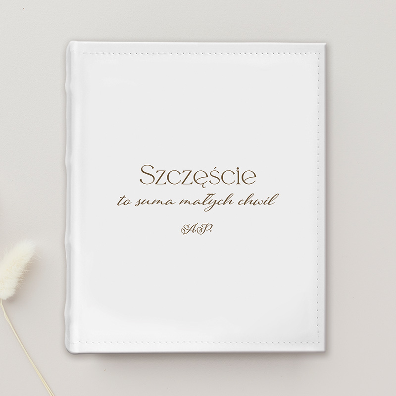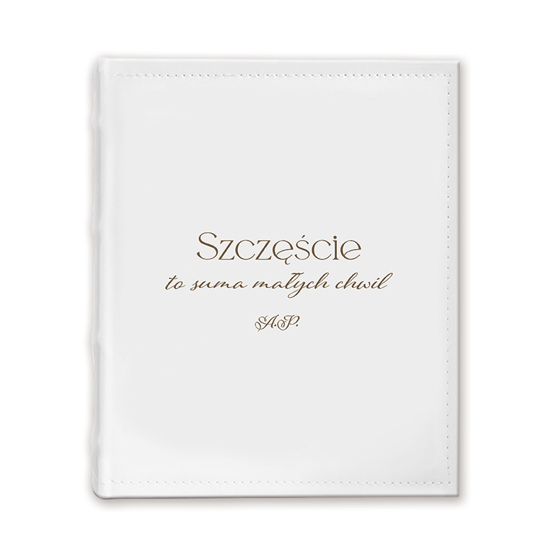 Zatrzymaj najpiękniejsze chwile w wyjątkowy sposób, personalizowany album na zdjęcia wklejane z elegancką białą okładką i napisem „Szczęście to suma małych chwil”