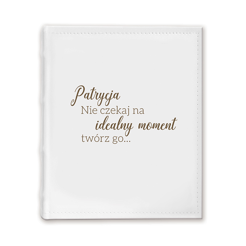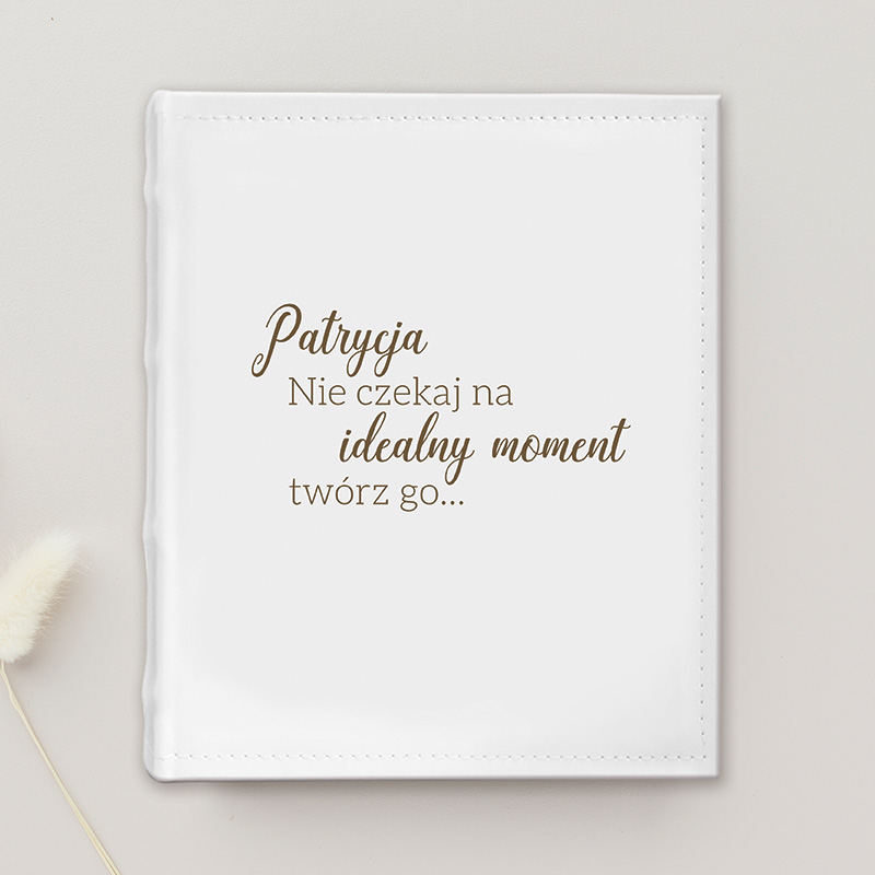 Personalizowany album na zdjęcia wklejane to elegancka i ponadczasowa pamiątka, która łączy w sobie wyjątkowy design z osobistym charakterem. Jasna okładka wykonana z wysokiej jakości materiału została ozdobiona stylowym napisem „Nie czekaj na idealny moment, twórz go…”, co nadaje całości inspirującego tonu. Dzięki personalizacji imieniem album zyskuje indywidualny charakter i staje się nie tylko estetycznym, ale również emocjonalnym prezentem.