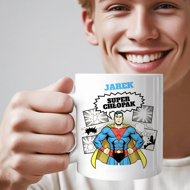 Kubek ozdobiony jest grafiką superbohatera w stroju z peleryną, otoczonego komiksowymi efektami specjalnymi. W centralnej części widnieje napis „Super Chłopak”, a całość uzupełnia personalizacja imieniem, dzięki czemu kubek od razu wiadomo, do kogo należy. Żywe kolory i dynamiczny styl nadruku nadają mu wyjątkowego, energetycznego charakteru.