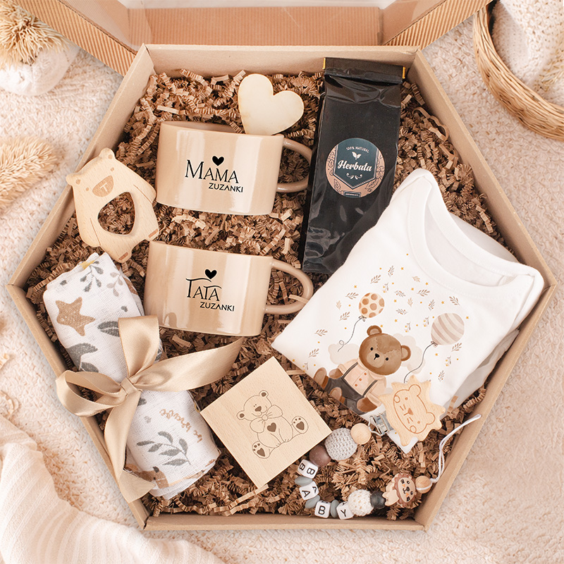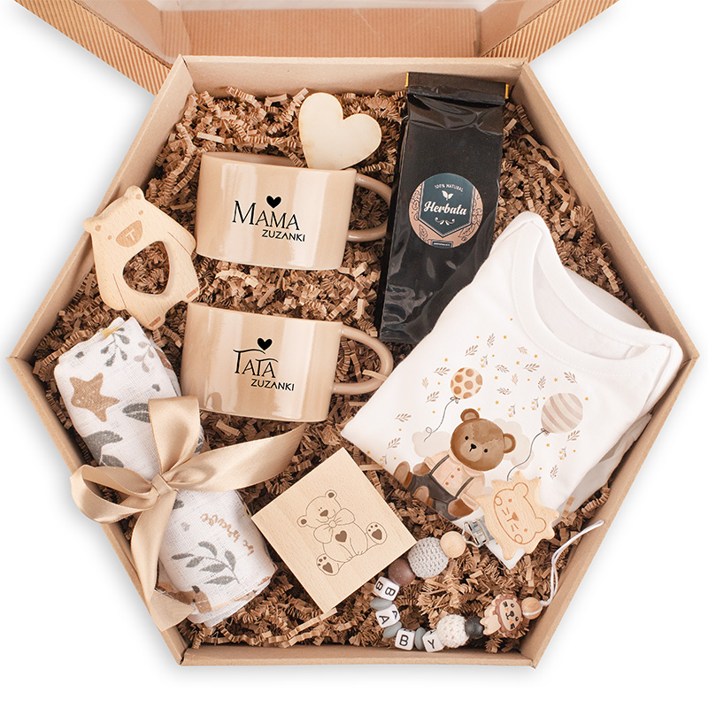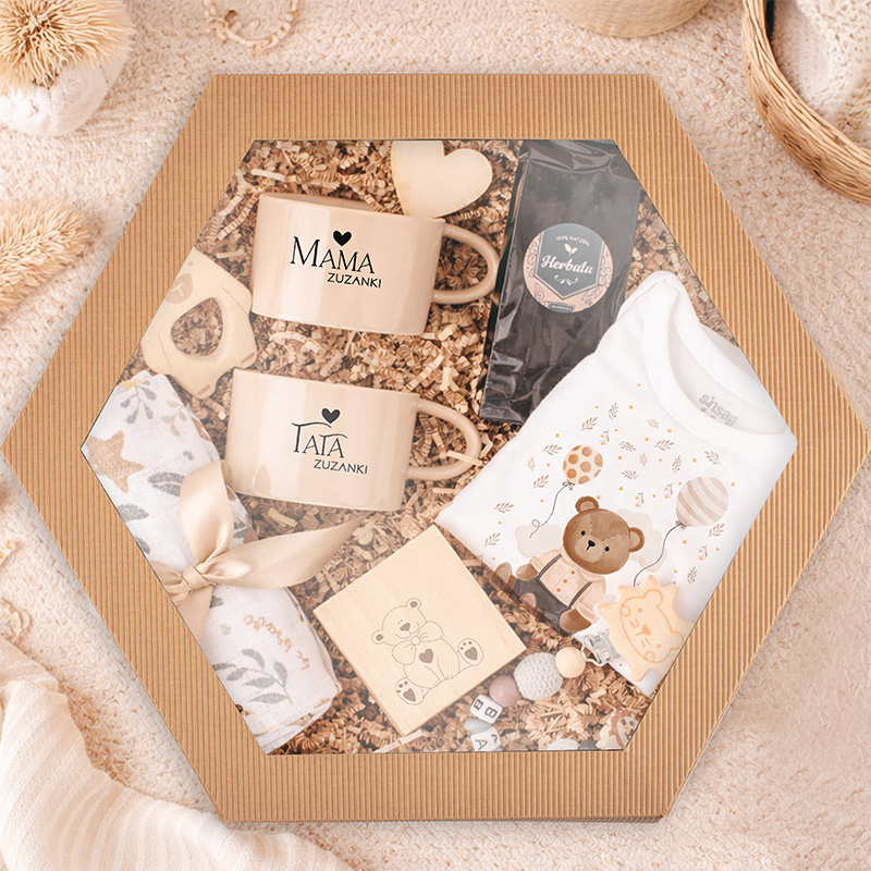 Zestaw zapakowany jest w pudełko z okienkiem w kształcie heksagonu, wypełnione naturalnym wypełnieniem. W środku znajdują się dwa ceramiczne kubki dla mamy i taty z możliwością personalizacji, które stanowią piękną pamiątkę. Dla dziecka przygotowano miękkie body z motywem misia, delikatną pieluchę tetrową, gryzak, zawieszkę do smoczka oraz drewnianą kostkę. Całość uzupełnia dekoracyjna tabliczka w kształcie serduszka oraz aromatyczna herbata dla rodziców. Zestaw wyróżnia się dopracowanymi detalami i harmonijnym wyglądem.