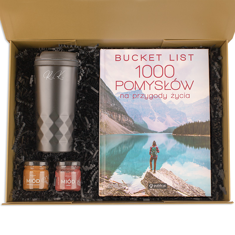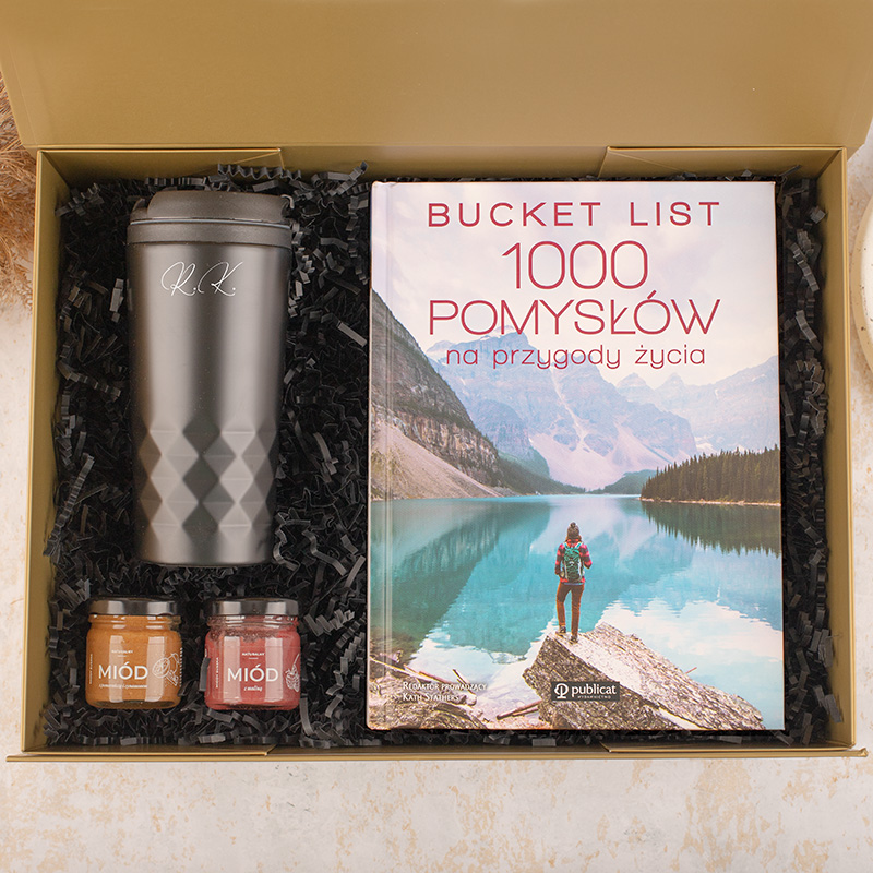 Zestaw prezentowy z personalizowanym kubkiem termicznym z inicjałami, książką „Bucket List”, dwoma słoiczkami miodu i personalizacją imienia na pudełku w złotym kolorze to uniwersalny pomysł na prezent dla kobiety lub mężczyzny na różne okazje.