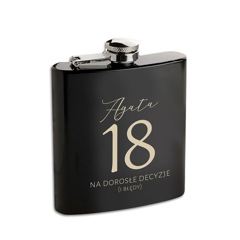 Piersiówka z grawerem to praktyczny prezent na 18 urodziny, który wyróżnia się spośród zwykłych prezentów osiemnastkowych. Wykonana w eleganckiej, czarnej kolorystyce z kontrastującym jasnym napisem, prezentuje się stylowo i nowocześnie. Na froncie znajduje się grawer z imieniem jubilata, dużą liczbą 18 oraz napisem „Na dorosłe decyzje (i błędy)”, który nadaje całości lekko humorystyczny ton.