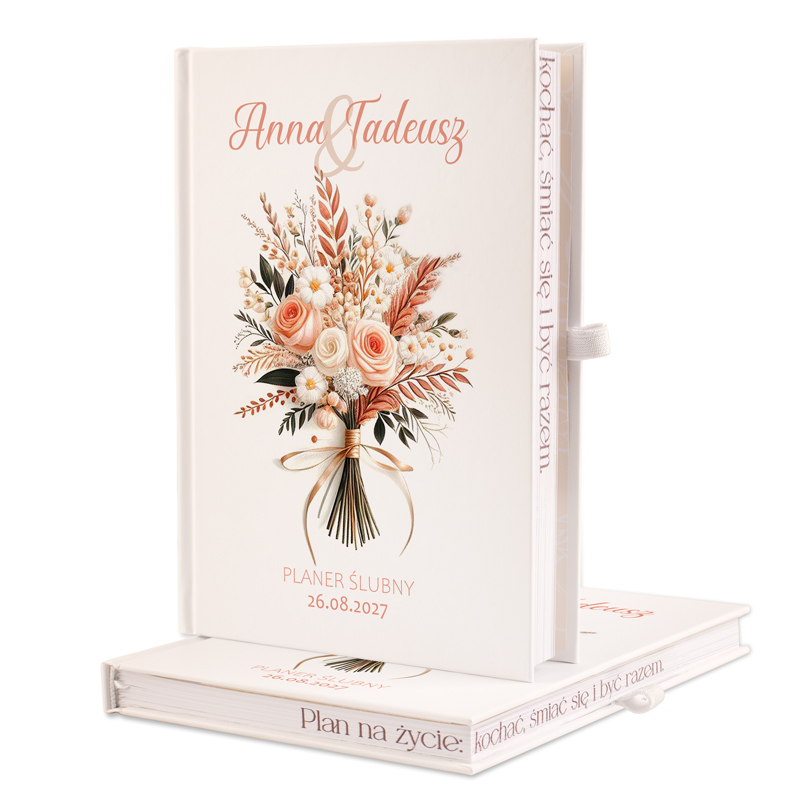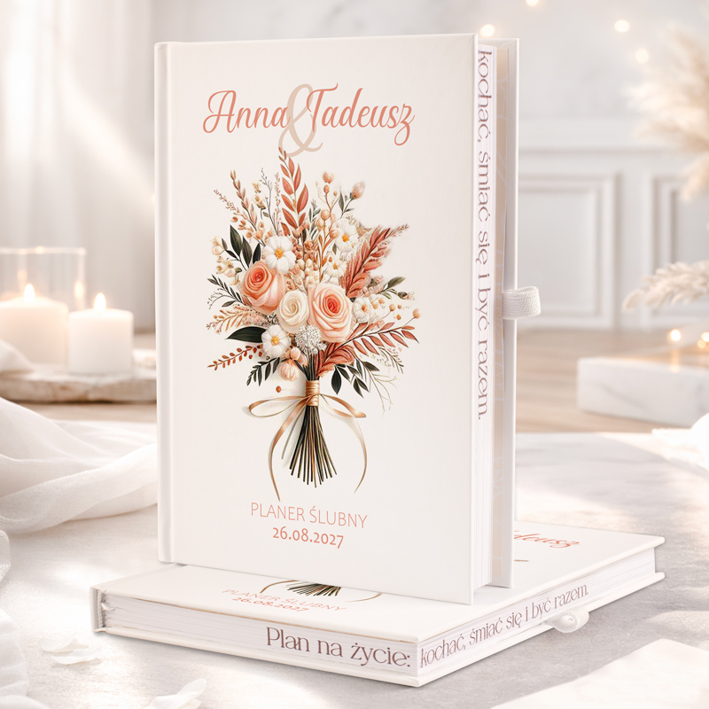 Planer ślubny to wyjątkowy prezent dla narzeczonych, który pomoże im zarządzać wszystkimi elementami ślubu — od miejsca uroczystości, przez listę gości, aż po szczegółowe planowanie dnia. Jego przemyślana struktura i praktyczny format zapewniają porządek i efektywność, towarzysząc Parze Młodej na każdym etapie przygotowań do ich wyjątkowego dnia.