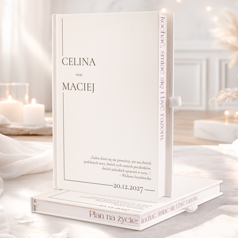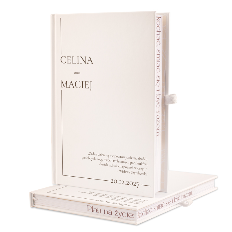 Personalizacja sprawia, że planer nabiera indywidualnego charakteru. To idealny sposób na zapisanie wspólnych planów, marzeń i inspiracji, które prowadzą do jednego z najważniejszych dni w życiu. Minimalistyczna, elegancka okładka zachwyca subtelnym designem. Estetyczna typografia i stonowana kolorystyka nadają jej stylowy wygląd, który pasuje do każdego ślubnego motywu. Okładka jest personalizowana imionami narzeczonych oraz datą ślubu, co czyni planer wyjątkową pamiątką tego ważnego dnia. Dodatkowo widnieje na niej piękny cytat Wisławy Szymborskiej, który dodaje całości romantycznego i refleksyjnego charakteru. Każdy szczegół został starannie dopracowany, aby korzystanie z planera było wygodne i przyjemne. Przemyślana konstrukcja sprawia, że planer jest nie tylko piękny, ale także praktyczny, co czyni go niezastąpionym pomocnikiem w ślubnych przygotowaniach.