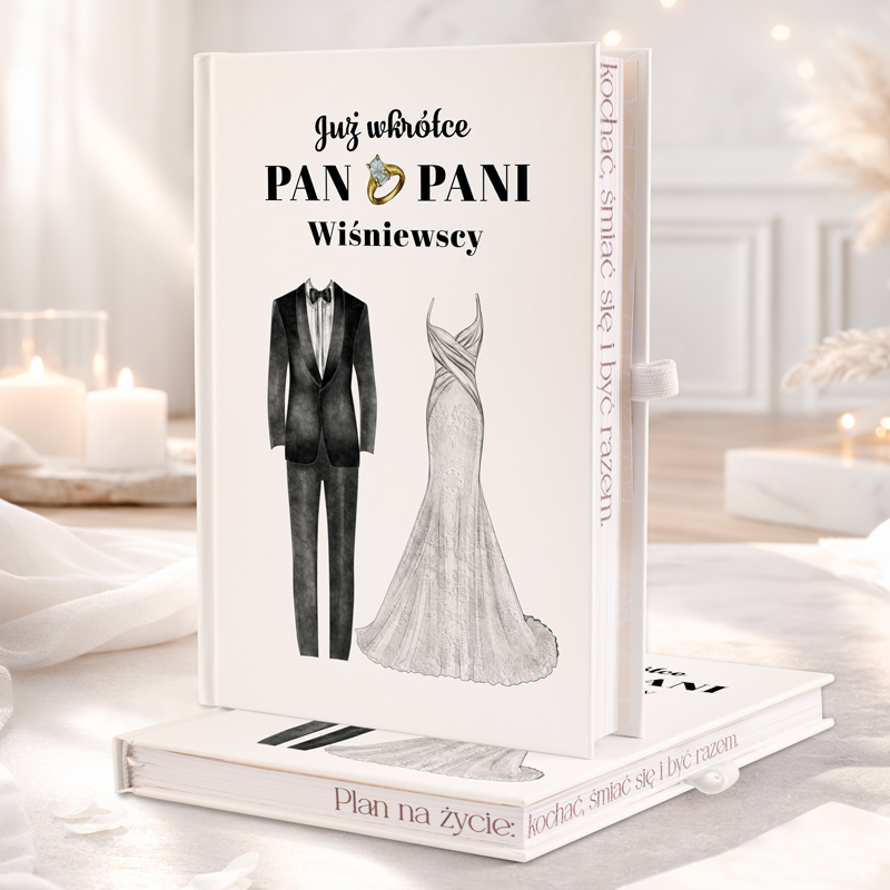 Warto nadmienić, że również sama okładka nawiązuje tematycznie do wydarzenia, ponieważ główne grafiki to nic innego jak elegancki garnitur ślubny i okazała biała suknia ślubna. Całość wieńczy napis, który znajduje się na górze okładki: Już wkrótce Pani i Pani + nazwisko.Organizer ślubny na notatki to praktyczny gadżet, który państwo młodzi powinni mieć pod ręką w okresie załatwiania ślubnych i weselnych spraw. To również pewnego rodzaju poradnik, z którego narzeczeni będą mogli czerpać podstawową wiedzę na temat szczegółów ślubnych. Okładka z personalizacją podkreśli indywidualny charakter planera, a także doskonale go wyróżni pośród innych kalendarzy, kajetów i notatników, które posiadają przyszli nowożeńcy. Wygodny format A5 zmieści do każdej damskiej torebki, będzie zawsze pod ręką. Po latach z kolei będzie to fajna pamiątka dla małżeństwa.