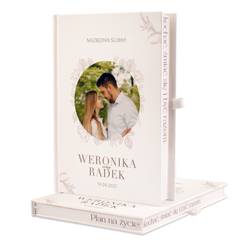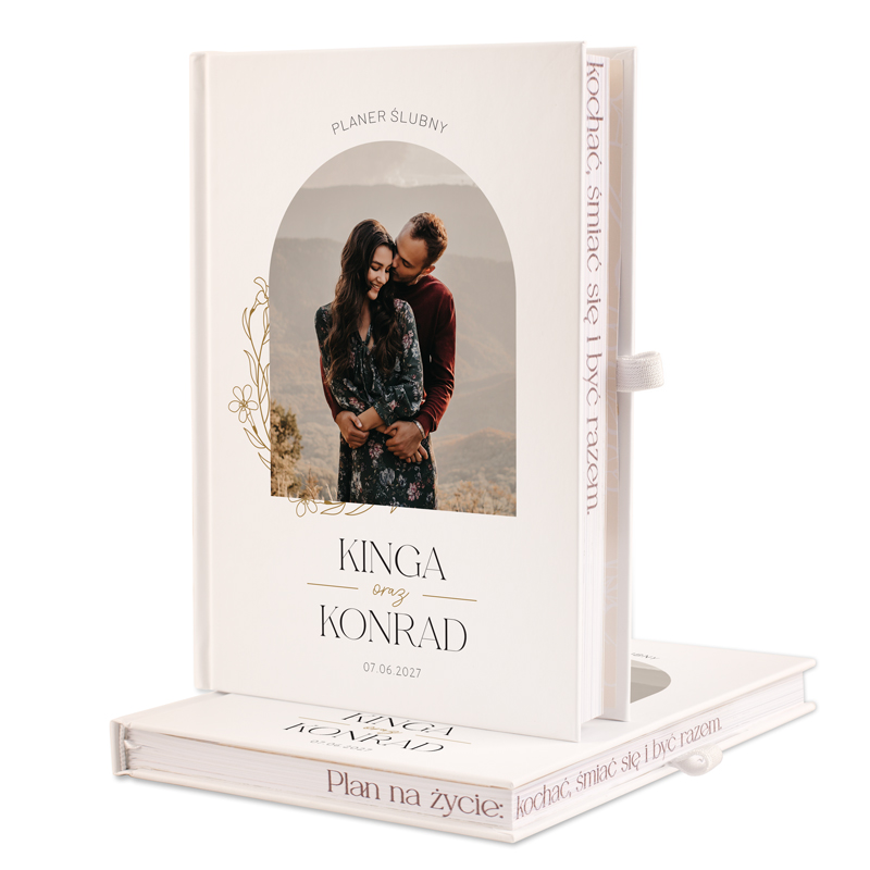 Oryginalny planer ślubny wyróżnia się zdjęciem na okładce. Organizer ma biały kolor, a na jego powierzchni umieścimy grafikę delikatnych liści. Nowoczesną czcionką wykonamy napis: PLANER ŚLUBNY. Personalizacji podlegają imiona Pary Młodej, jak również data zaplanowanego ślubu. Wewnątrz niezbędnika na końcu znajduje się specjalna kieszonka do umieszczania umów i dokumentów. Z boku widnieje gumka, która posłuży jako miejsce na długopis.