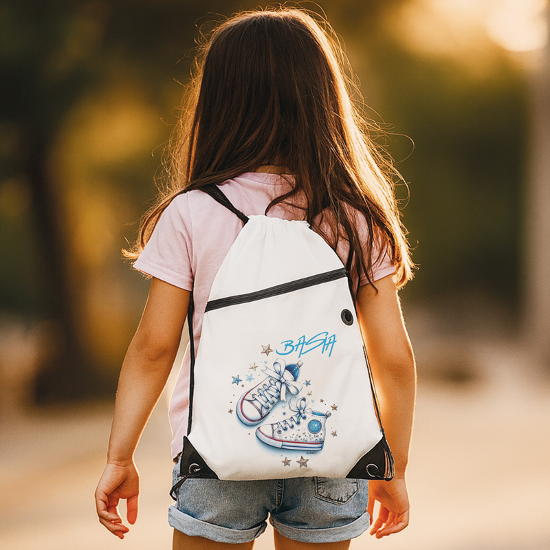 W dynamicznym świecie dzieci, gdzie każdy dzień to nowa przygoda, praktyczne rozwiązania są kluczowe. Personalizowany plecak na buty jest właśnie takim rozwiązaniem – odpornym na przeciwności pogody i doskonale dopasowanym do energicznego trybu życia dziecka. Wodoodporny plecak zapewnia bezproblemowe przechowywanie obuwia sportowego, a także innych małych przedmiotów niezbędnych aktywnemu dziecku. Regulowane sznurki ułatwiają dostosowanie plecaka do wzrostu, gwarantując komfort noszenia. Kolorowa grafika przedstawia dziewczęce trampki w biało-niebieskiej kolorystyce. Buty zdobią delikatne elementy roślinne. Wokół trampek widać małe złote gwiazdki. Nad rysunkiem znajduje się imię właścicielki plecaka wypisane w niebieskim kolorze.