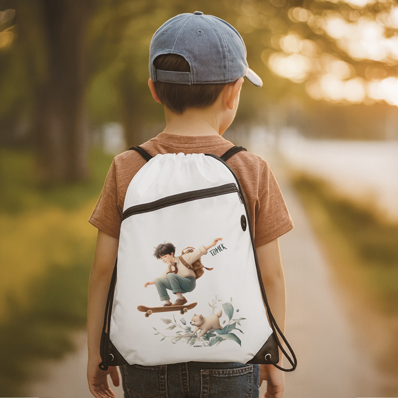 Worek na deskorolkę wyróżnia się odpornością na uszkodzenia dzięki zastosowaniu wytrzymałego materiału, który gwarantuje długotrwałość nawet przy intensywnym użytkowaniu. Na jego białym tle znajduje się starannie wykonana grafika, która przedstawia chłopca na deskorolce w towarzystwie wiernego psa, umieszczone wśród estetycznie dopracowanych detali roślinnych. Kolorowa grafika nie tylko przyciąga wzrok, ale także pozwala dziecku wyróżnić się w tłumie. Personalizacja worka poprzez dodanie imienia na froncie sprawia, że staje się on wyjątkowym i bardzo osobistym prezentem. Ergonomiczne sznurki ułatwiają otwieranie i zamykanie worka, co dodatkowo zwiększa komfort użytkowania, a mała, zewnętrzna kieszonka na zamek błyskawiczny to doskonałe miejsce na przechowywanie drobnych skarbów. Maksymalizuj wygodę podczas słuchania muzyki czy korzystania z powerbanka! Worek na deskorolkę  wyposażony jest w praktyczny otwór na froncie, który umożliwia łatwe przeciągnięcie kabla od słuchawek lub powerbanka. Idealne rozwiązanie dla aktywnych!