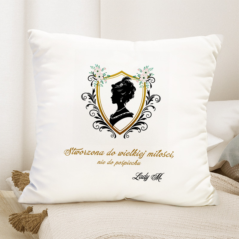 Ta poduszka w stylu Bridgerton to połączenie klasyki, dekoracyjnego stylu i kobiecego wyrazu. W centrum znajduje się profil kobiety w złotej ramie ozdobionej kwiatami. Całość dopełnia napis: „Stworzona do wielkiej miłości, nie do pośpiechu” oraz personalizowany inicjał. Dzięki temu produkt wyróżnia się spośród typowych dekoracji. Co ważne, nawiązuje bezpośrednio do klimatu epoki regencji, dlatego idealnie trafia w gust fanek estetyki znanej z serialu.