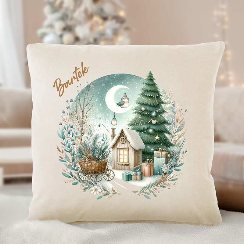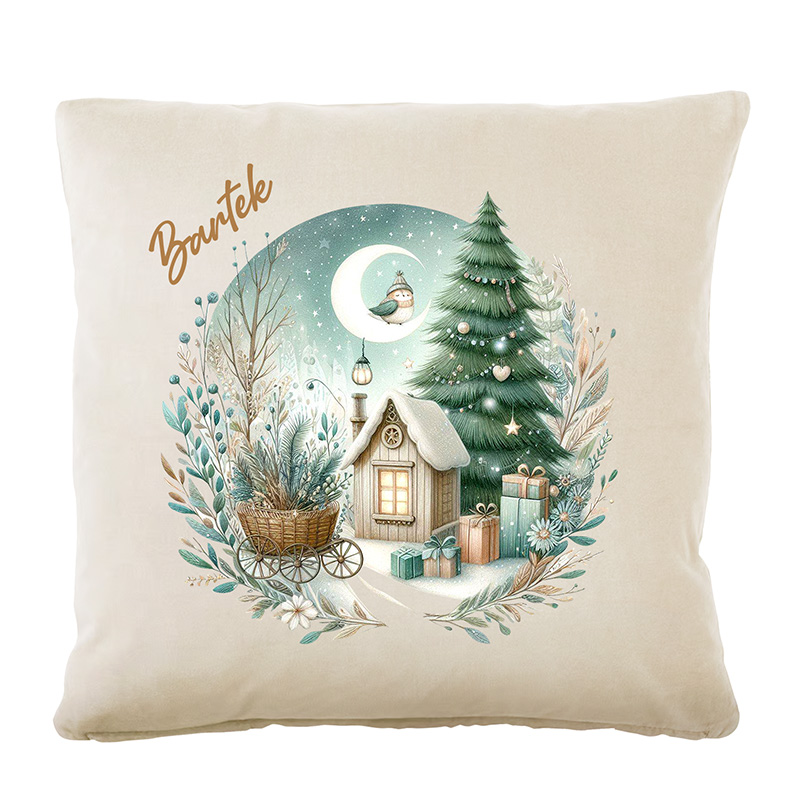 Welurowa poduszka wykonana jest z miękkiego, przyjemnego w dotyku materiału. Wyróżnia się jasnym, beżowym odcieniem, który pięknie komponuje się z zimowym motywem. Na środku znajduje się ilustracja przedstawiająca domek, choinkę i gwiazdki, które tworzą bajkowy krajobraz. Nad nimi widnieje księżyc, a obok wesoły ptaszek, który dodaje całości lekkości. Na poduszce umieszczone jest imię dziecka, dlatego prezent nabiera indywidualnego charakteru. Personalizacja sprawia, że to właśnie ta poduszka staje się ulubionym elementem świątecznej dekoracji. Nadruk jest trwały i odporny na pranie, dlatego przez długi czas zachowuje swoje kolory. Co więcej, całość ma standardowy rozmiar, więc idealnie nadaje się do łóżka, fotela lub kanapy. Dzięki miękkiej strukturze poduszka nie tylko ozdabia, ale też zapewnia wygodę podczas odpoczynku. Można się na niej oprzeć, przytulić lub położyć obok niej ulubionego misia. W związku z tym staje się nie tylko dekoracją, lecz także elementem codziennych chwil relaksu.