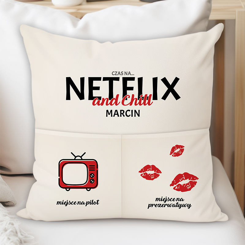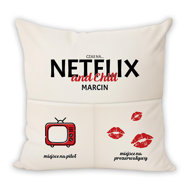 Poduszka z napisem "Czas na... NETFLIX and Chill Marcin" oraz ilustracjami telewizora i czerwonych ust. Tekst wskazuje na miejsca na pilota i prezerwatywy.