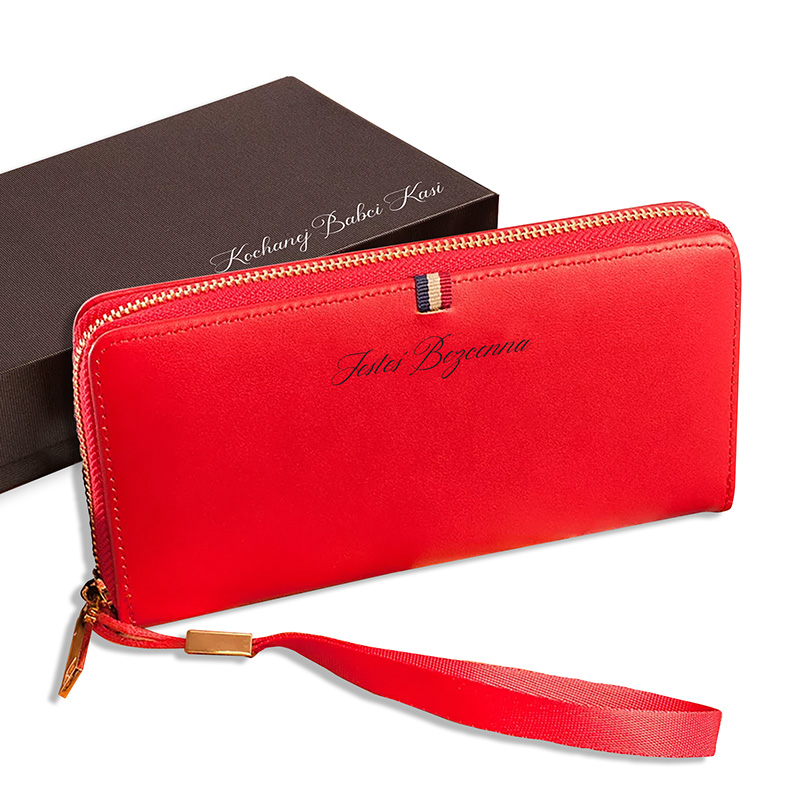 Portfel wykonany jest ze skóry w czerwonym kolorze, który symbolizuje energię, klasę i kobiecość. Na jego froncie znajduje się wzruszający napis “Jesteś bezcenna”. Praktyczny układ wnętrza pozwala wygodnie przechowywać banknoty, monety, karty i dokumenty, dzięki czemu portfel doskonale sprawdza się w codziennym użytkowaniu. Całość uzupełnia eleganckie pudełko prezentowe z dedykacją “Kochanej Babci” oraz imieniem, co sprawia, że prezent jest gotowy do wręczenia bez dodatkowego pakowania.