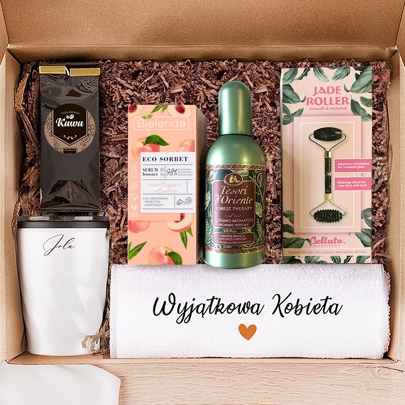 Ekskluzywny zestaw prezentowy dla bliskiej osoby zamknięty w stylowym pudełku. To idealny pomysł na upominek urodzinowy, rocznicowy bądź choinkowy. Okazji do jego wręczenia jest mnóstwo. W boxie znajdują się kosmetyki, a także aromatyczna herbata i inne akcesoria, które czynią z niego znakomity wybór szczególnie dla kobiety. Zestaw prezentowy z kosmetykami spakowany w kraftowe pudełko w ekologicznym stylu. W zestawie znalazła się także aromatyczna kawa. Komplet kosmetyków ułatwi codzienną pielęgnację skóry. Kubek termiczny w kolorze białym, z grawerunkiem w postaci imienia właścicielki przyda się zarówno latem, jak i zimą do zimnych i do gorących napojów. Biały ręczniczek z napisem „Wyjątkowa Kobieta” to z kolei praktyczny dodatek i sposób na podkreślenie znaczenia osoby obdarowanej.