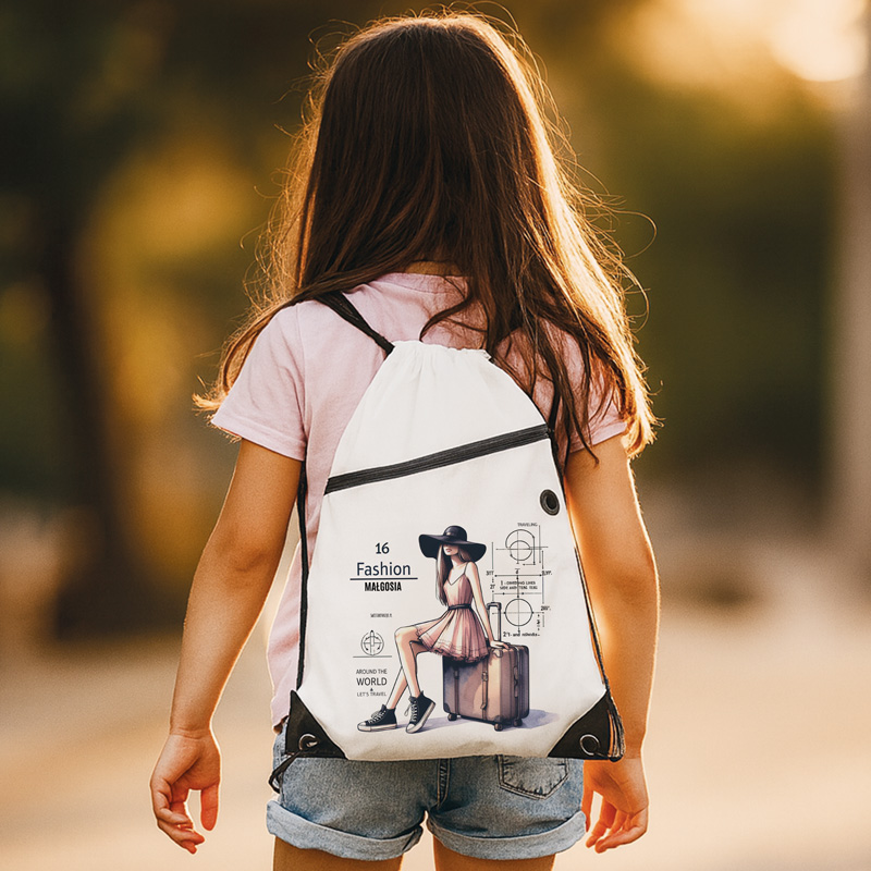 Stylowy worek ze sznurkami to doskonały prezent dla nastoletniej dziewczyny, który łączy w sobie funkcjonalność, modny design i osobisty charakter. Został zaprojektowany z myślą o młodych kobietach, które cenią wygodę i chcą się wyróżniać. Biały kolor worka w połączeniu z grafiką modnej dziewczyny przy walizce oraz technicznymi schematami tworzy oryginalną i nowoczesną kompozycję inspirowaną modą. Personalizacja imieniem oraz wiekiem sprawia, że worek staje się niepowtarzalnym dodatkiem.