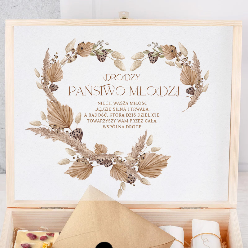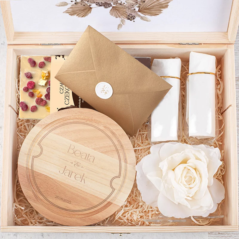 Elegancki prezent ślubny w postaci drewnianej skrzyni z grawerem na wieczku, życzeniami w środku i bogatym zestawem prezentowym. W zestawie znajdują się dwa kieliszki ze złotym rantem, czekoladki z całymi orzechami, koperta na kartkę lub pieniądze oraz deska na przystawki. Drewniana deska do podawania przystawek posiada na wierzchu grawer w postaci imion nowożeńców oraz daty ich ślubu. Wieko jest przesuwane. W środku deski skrywają się akcesoria z drewnianymi rękojeściami: nóż, widelec i otwieracz. Na wieczku widnieje piękny grawer z wizerunkiem pary młodej. Przy rysunku będzie znajdował się cytat o miłości: Jedno jest tylko w życiu szczęście. Kochać i być kochanym. Dopełnieniem wnętrza będzie zdobiona wklejka z nietuzinkowym sercem, które będzie tworzyły motywy kwiatowe.