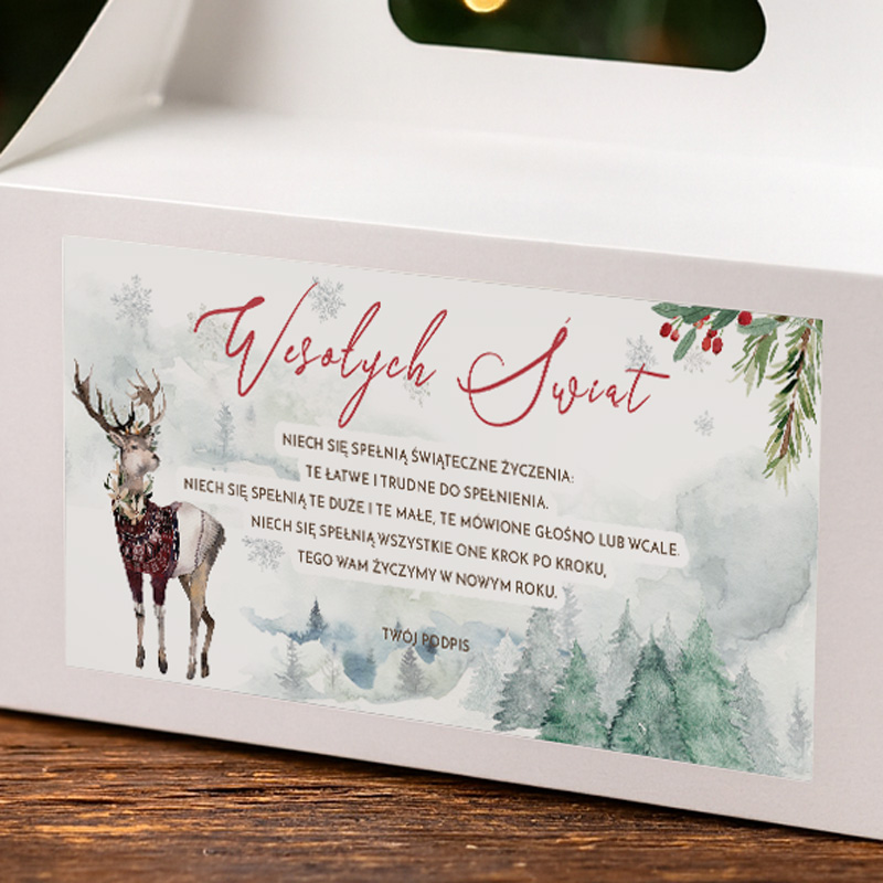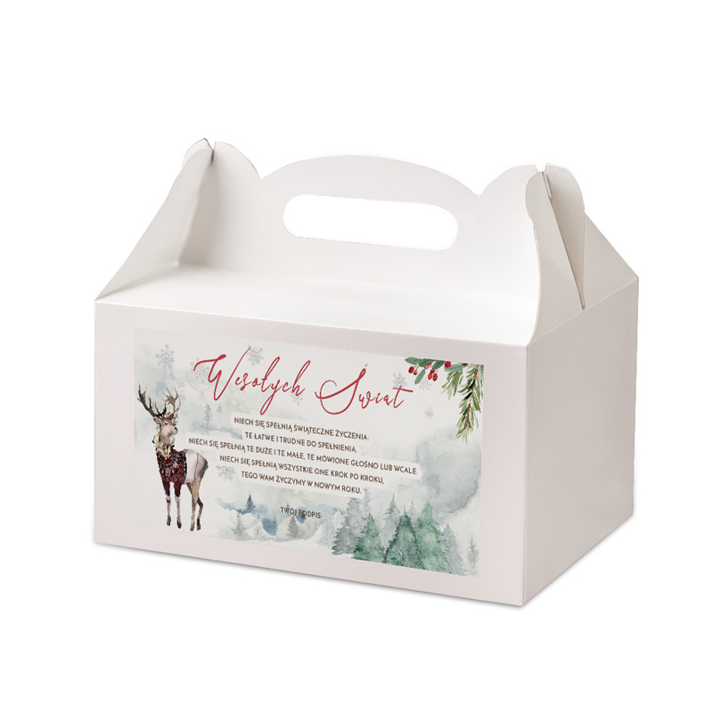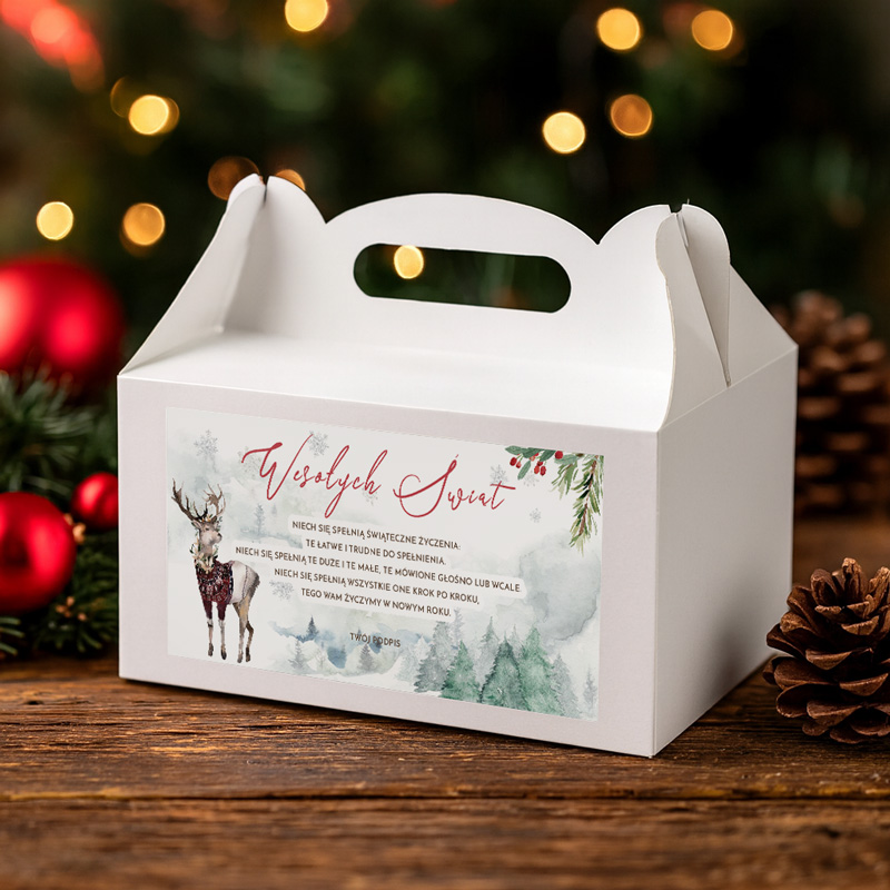 Zestaw zawiera dziesięć pudełek z uchwytem, ozdobionych delikatną zimową grafiką z reniferem, świerkami i subtelnymi akcentami świątecznymi. Front zdobi tekst życzeń „Wesołych Świąt”, utrzymany w estetycznym stylu, który dobrze komponuje się z pastelową ilustracją.