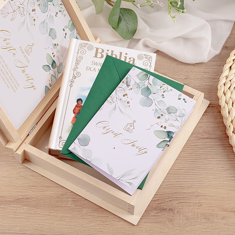 Pudełko wykonane z naturalnego drewna, o jasnym odcieniu, na zewnętrznej części wieczka umieszczony jest napis: Pamiątka Chrztu Świętego. Wewnątrz pudełka umieszczona jest na białym tle piękna grafika przedstawiająca delikatne zielone listki i kościółek. Na wklejce znajduje się tekst: