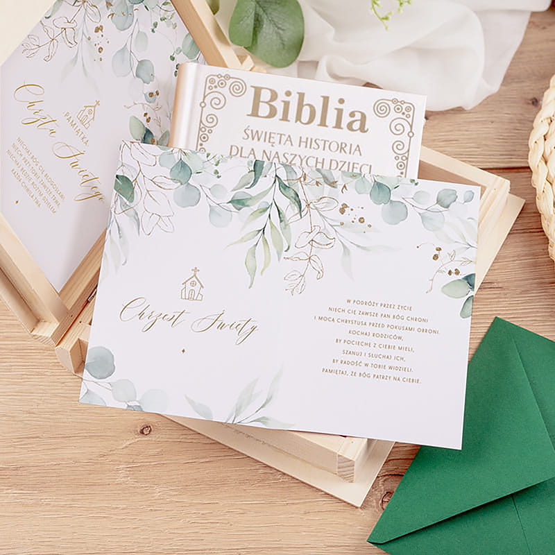Dodatkowo w zestawie znajduje się kartka z kopertą. Pudełko wraz z Biblią to przepiękny prezent, oraz pamiątką z okazji Chrztu Świętego maluszka, pozostanie pamiątką na długie lata.