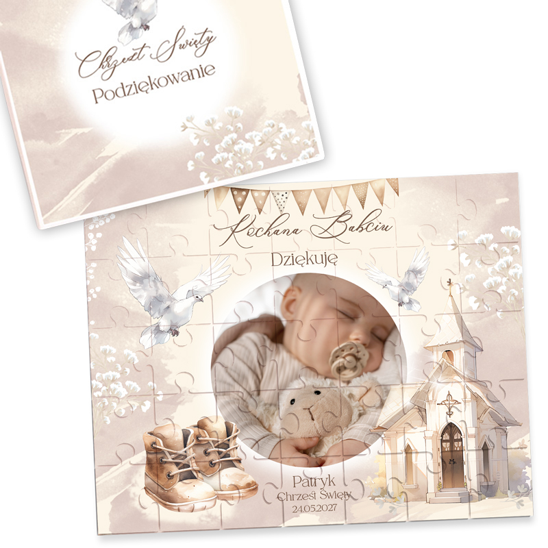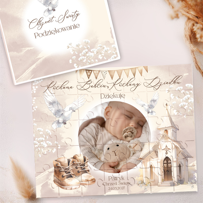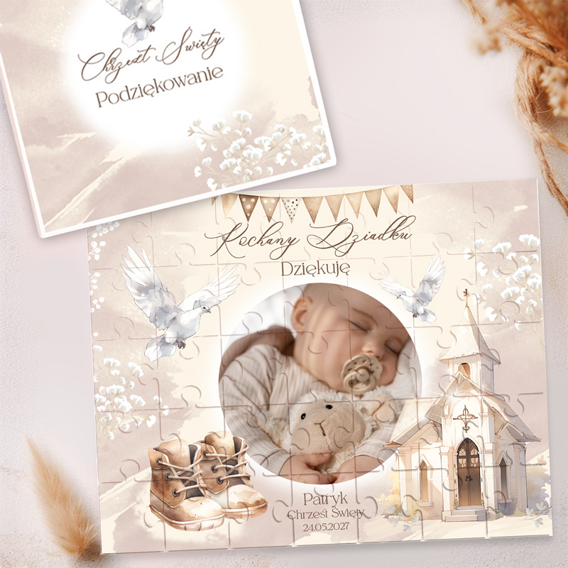 Personalizacja sprawia, że PUZZLE ze zdjęciem podziękowanie dla dziadków na Chrzest Św. nabierają wyjątkowego charakteru. Wzór można dostosować, wybierając wersję dla babci, dziadka lub dla obojga dziadków. Na powierzchni znajduje się zdjęcie dziecka, jego imię oraz data Chrztu Świętego. Dodatkowo eleganckie elementy graficzne, takie jak gołębie, złote akcenty czy delikatne kwiaty, podkreślają uroczysty charakter prezentu. Wysokiej jakości materiały gwarantują trwałość puzzli, dzięki czemu kolory pozostają intensywne przez długi czas. Po ułożeniu mogą stać się piękną dekoracją, którą dziadkowie z dumą postawią w swoim domu.