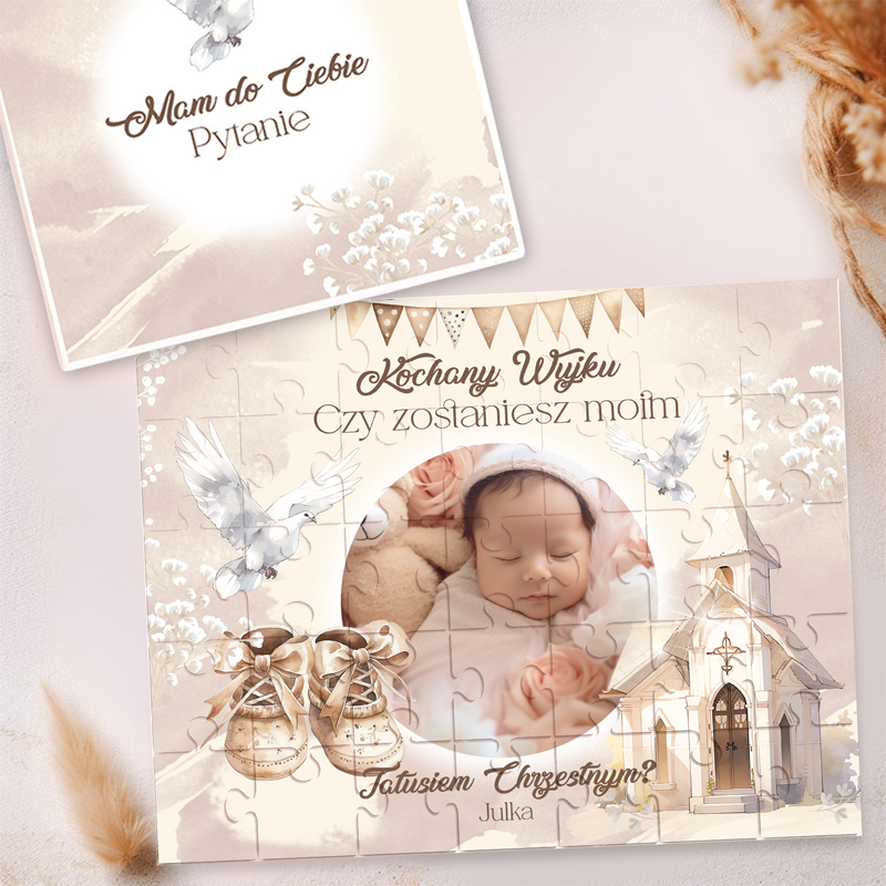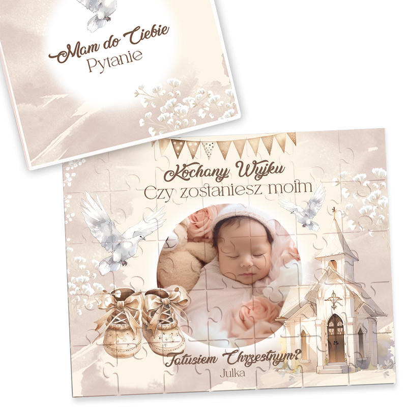 Niebanalna forma zaproszenia zamienia tę chwilę w prawdziwie magiczny moment – pełen emocji, radości i wzruszeń. Każdy element układanki to część większej historii. Kiedy ukochany wujek ułoży wszystkie puzzle, jego oczom ukaże się pytanie: „Czy zostaniesz moim Tatusiem Chrzestnym?” wraz ze zdjęciem maluszka. Dzięki temu forma przekazu zyskuje osobisty, a zarazem zaskakujący charakter. Puzzle mają wysoką jakość wykonania. Druk jest wyraźny, kolory pastelowe, a wzór – subtelny i pełen symboliki. Delikatne kwiaty, kościółek i białe gołębie tworzą spójną, duchową oprawę. W zestawie znajduje się także ozdobne pudełko z napisem „Mam do Ciebie pytanie”, dzięki czemu cały prezent zyskuje elegancki charakter.
