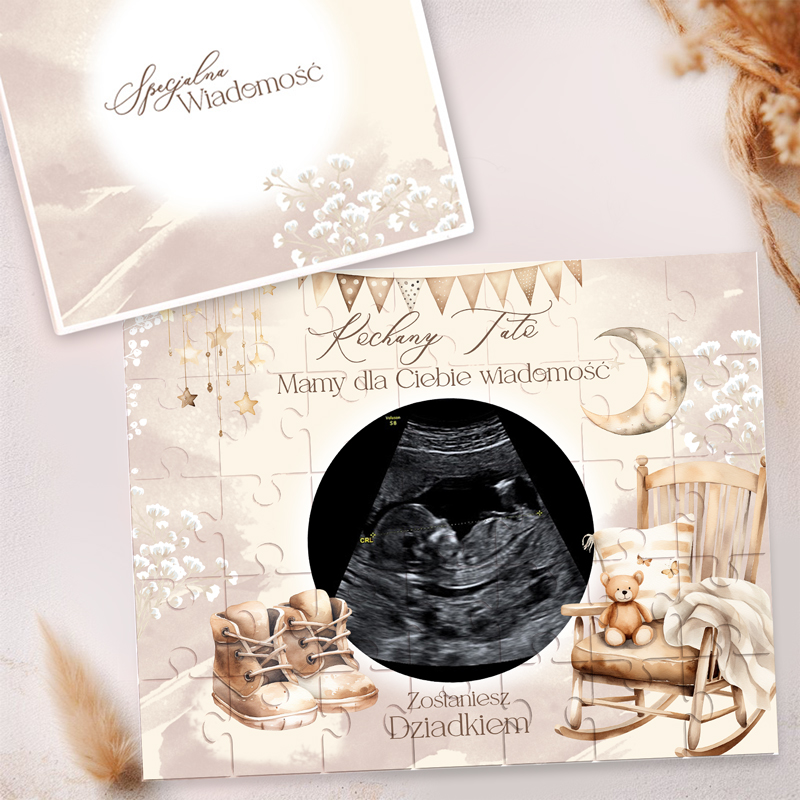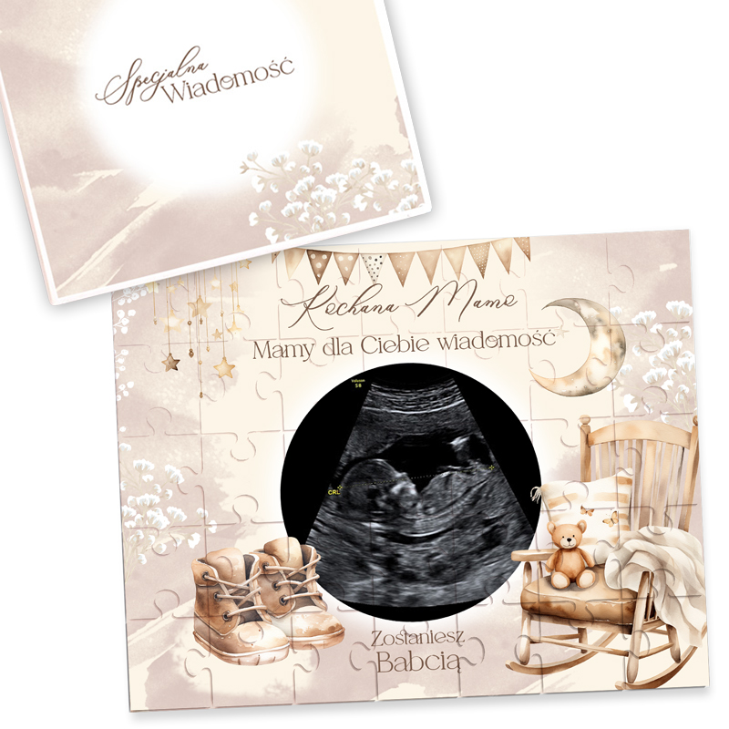 To prezent, który wzrusza, zaskakuje i na długo pozostaje w pamięci. Układanka składa się z 35 elementów. Po złożeniu ukazują się urocze buciki, księżyc, misio na fotelu oraz miejsce na zdjęcie USG i personalizowany napis, np. „Kochana Mamo, Mamy dla Ciebie wiadomość – Zostaniesz Babcią” lub „Kochany Tato, Zostaniesz Dziadkiem!”. Całość utrzymana jest w jasnej, pastelowej kolorystyce, co nadaje kompozycji delikatności i elegancji. Odbiorca samodzielnie odkrywa wiadomość, układając elementy jeden po drugim. To emocjonalny moment, który zbliża i buduje jeszcze silniejsze więzi rodzinne. Do zestawu dołączono także elegancką kopertę z napisem „Specjalna wiadomość”, dzięki czemu prezent od razu nadaje się do wręczenia.