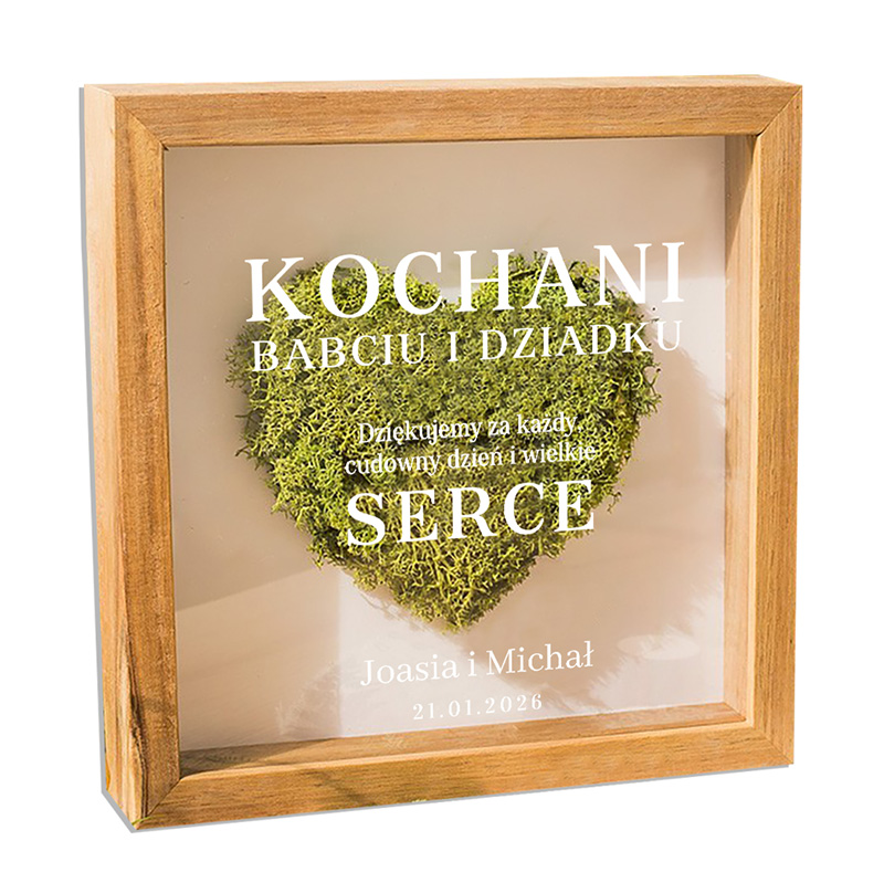 Produkt wykonany jest w formie ramki, wewnątrz której umieszczone zostało efektowne serce z mchu. Zielona struktura mchu pięknie kontrastuje z jasnym tłem, tworząc harmonijną i przyciągającą wzrok kompozycję. Na froncie znajduje się napis z podziękowaniem oraz możliwość personalizacji podpisu oraz daty. Ramka dostępna jest w trzech wariantach – jako prezent wspólny dla babci i dziadka lub osobno: dla babci albo dla dziadka.
