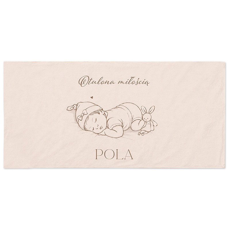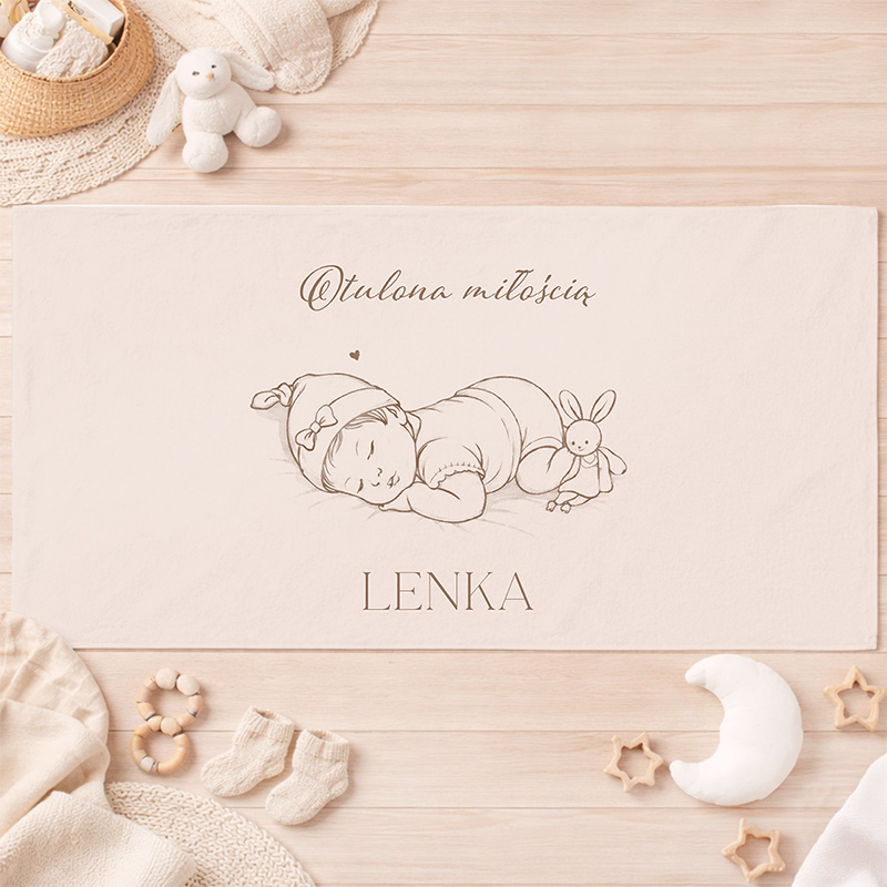 Ręcznik został wykonany z miękkiego i chłonnego materiału, dlatego doskonale sprawdza się podczas codziennej pielęgnacji maluszka. Jasna, beżowa kolorystyka nadaje mu elegancki charakter, dlatego idealnie pasuje do wyprawki niemowlęcej. Na powierzchni ręcznika znajduje się minimalistyczna grafika śpiącego dziecka oraz napis „Otulona miłością”. Dodatkowo ręcznik personalizowany jest imieniem dziewczynki. Duży rozmiar ręcznika zapewnia wygodę podczas wycierania i otulania dziecka po kąpieli, dlatego świetnie sprawdzi się zarówno w domu, jak i w podróży.