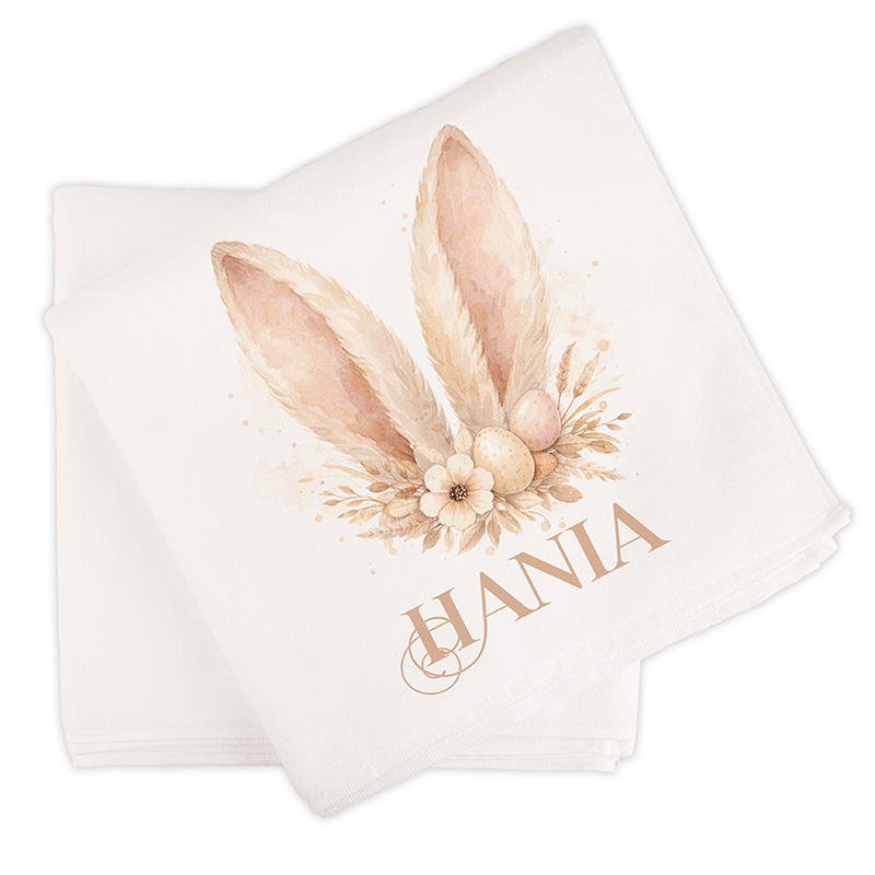 Ręcznik wykonany jest z miękkiego i przyjemnego w dotyku materiału. Na jego powierzchni znajduje się delikatna, wielkanocna grafika przedstawiająca królicze uszy ozdobione kwiatami oraz pisankami w pastelowych kolorach. Pod ilustracją umieścimy imię dziecka, które nadaje ręcznikowi indywidualnego charakteru.