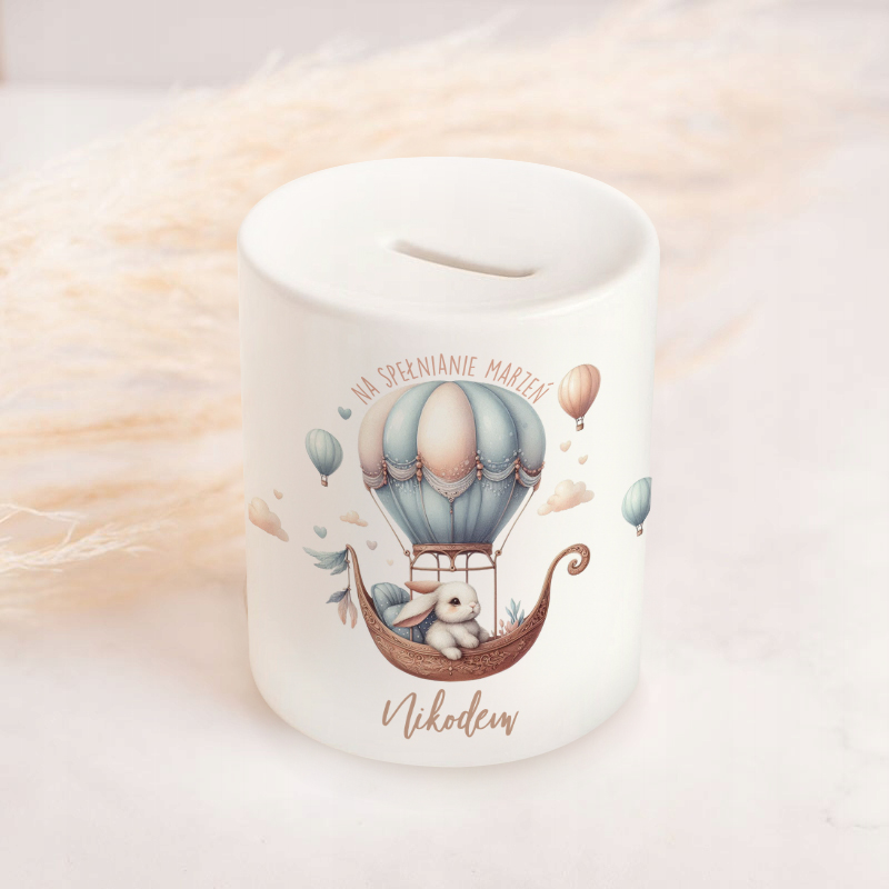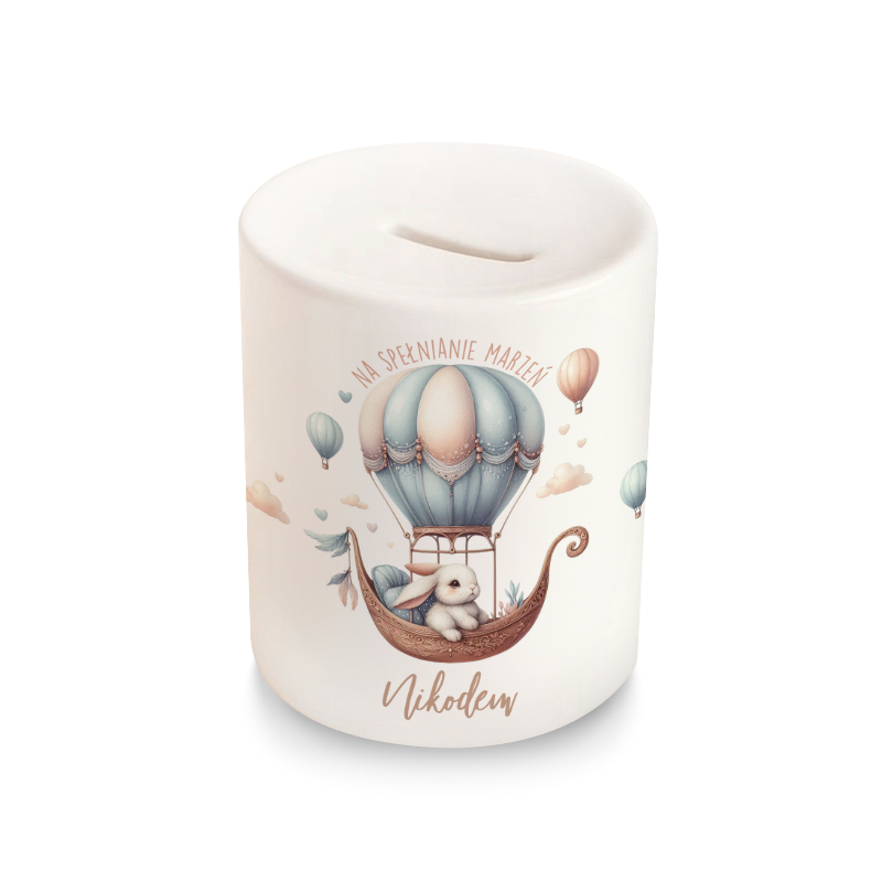 Ceramiczna skarbonka z kolorowym nadrukiem przedstawiającym balon na gorące powietrze unoszący się nad siedzącym na łodzi króliczkiem, z napisem 'NA SPEŁNIANIE MARZEŃ' oraz imieniem 'Nikodem' na dole.