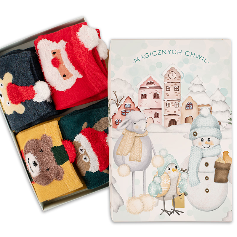 W zestawie znajdują się cztery par miękkich i przyjemnych skarpetek, każda w świątecznym motywem – m.in. Mikołaj, renifer, miś oraz bałwanek. Skarpetki wykonane zostały z materiału, który zapewnia komfort noszenia i ciepło. Są elastyczne, dobrze dopasowują się do stopy. To klasyka świątecznej garderoby, która nigdy się nie nudzi.