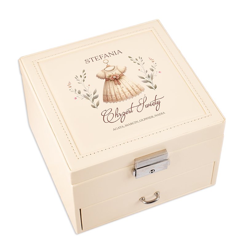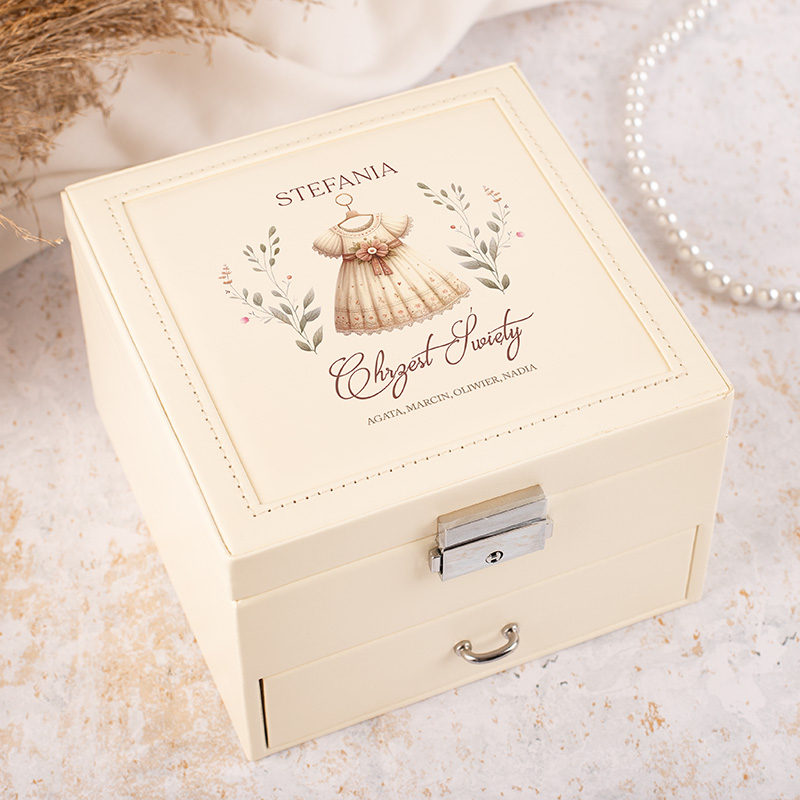 Szukasz wyjątkowego upominku? Ta personalizowana szkatułka na biżuterię to idealny prezent na Chrzest dla Dziewczynki od matki chrzestnej. Na wieczku widnieje imię dziecka oraz chrzestnej, co czyni ją osobistą i wzruszającą pamiątką. Lusterko oraz dodatkowa szufladka dodają całości funkcjonalności. Zamknięcie na kluczyk sprawia, że przechowywanie dziecięcych skarbów jest bezpieczne.