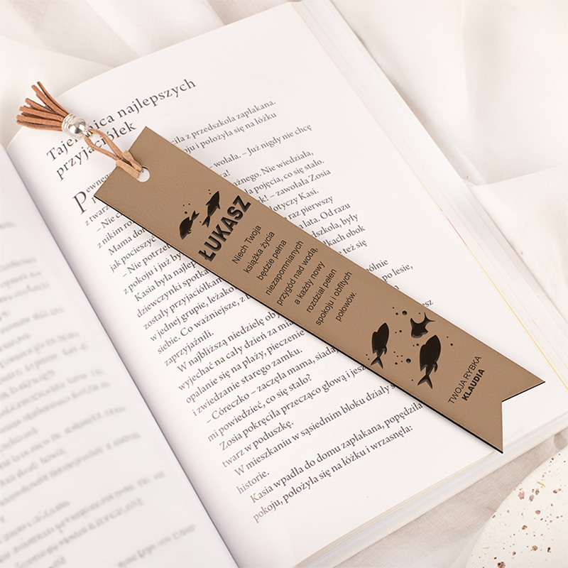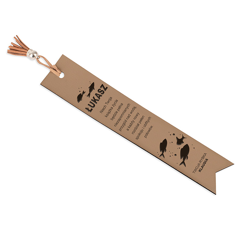 Wyjątkowość zakładki polega przede wszystkim na możliwości jej personalizacji. Na skórzanej powierzchni umieścisz imię osoby, której zakładkę podarujesz. Imię znajduje się na samej górze, obok grafiki przedstawiającej ryby, które symbolicznie podkreślają wędkarską pasję. Poniżej imienia znajduje się cytat związany z pasją do rybołówstwa. Natomiast dolna część zakładki jest miejscem, w którym umieścisz krótką informację, od kogo jest prezent.