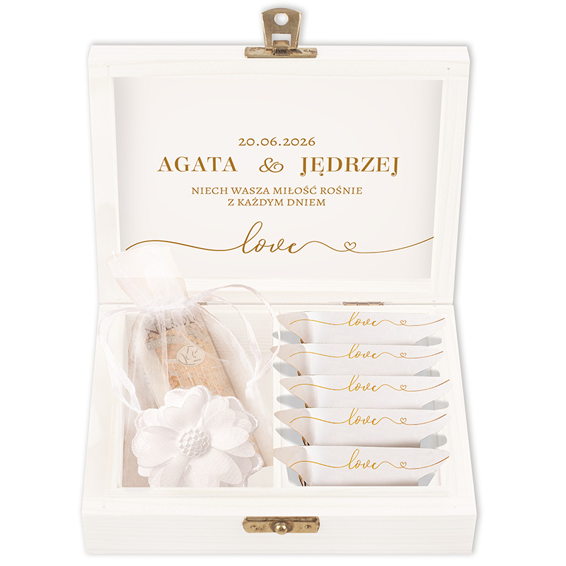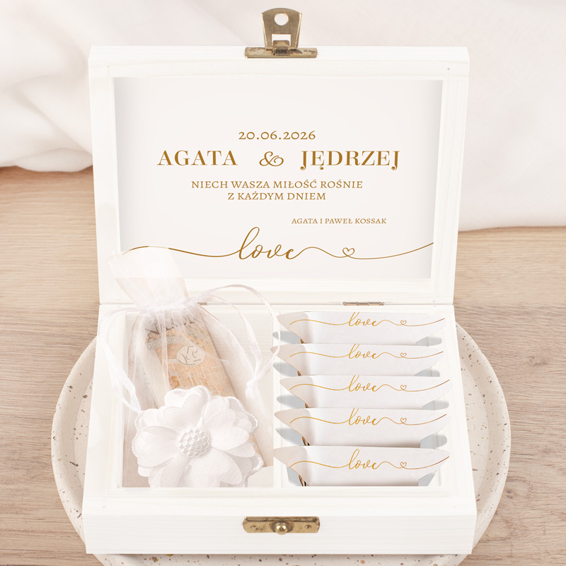 Elegancka drewniana skrzyneczka na pieniądze dla Pary Młodej to wyjątkowy sposób na wręczenie prezentu ślubnego, który zachwyci nowożeńców. Podaruj Młodej Parze coś oryginalnego, co doskonale zastąpi klasyczną białą kopertę. Biała kolorystyka z ilustracją splecionych dłoni, doskonale wpisuje się w elegancki charakter dnia Ślubu. Dzięki personalizacji, która znajduje się wewnątrz skrzyneczki, imion nowożeńców oraz daty ślubu, całość zyskuje unikalny charakter. Wnętrze dopełniają życzenia „Niech Wasza miłość rośnie z każdym dniem”. Ponadto nadrukowany jest tam również podpis od kogo jest prezent.