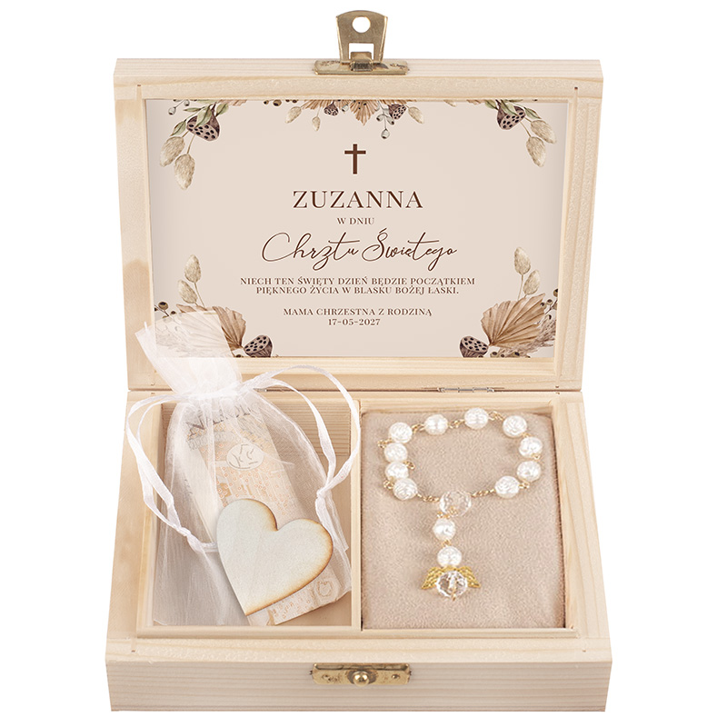 Zestaw składa się z drewnianej skrzyneczki z grawerem na wieczku. W środku znajduje się różaniec. Obok niego umieszczono woreczek, dzięki któremu można wręczyć pieniądze w niezwykle elegancki sposób. Na wewnętrznej stronie wieczka umieszczono personalizowaną wklejkę. Imię dziecka, data Chrztu oraz podpis tworzą wzruszającą całość, która z pewnością zostanie doceniona przez obdarowaną rodzinę. Stylowe inspirowane stylem boho grafiki pięknie komponują się z całą kompozycją, tworząc niezwykle estetyczny i subtelny efekt.
