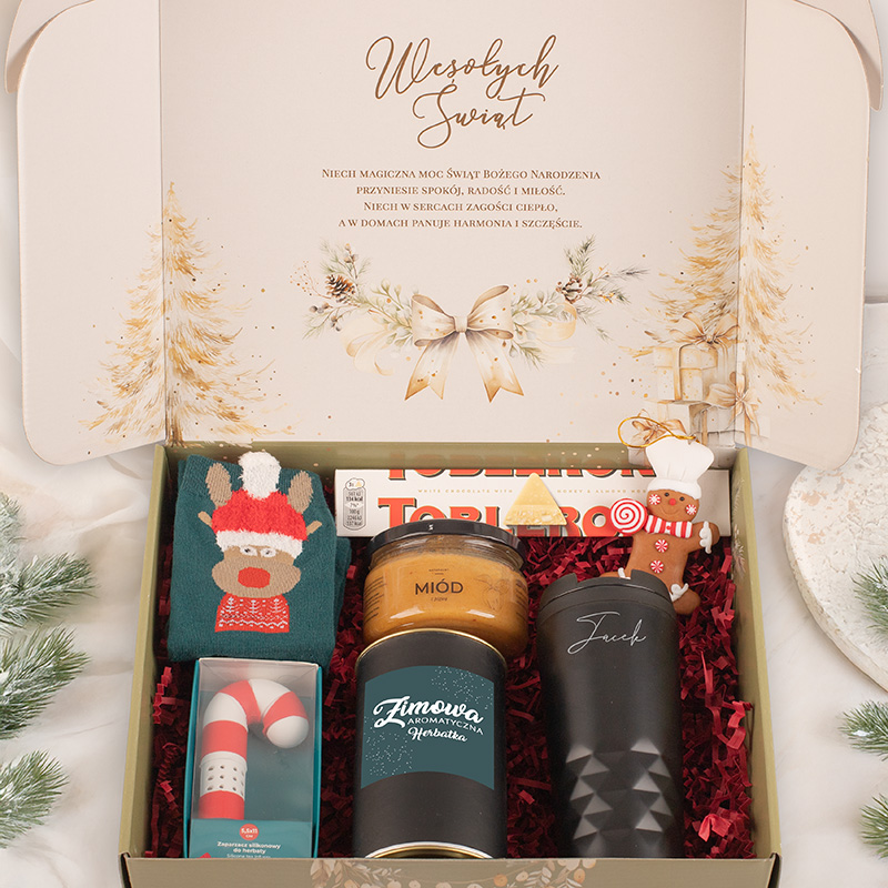 W zestawie znalazł się kubek termiczny w czarnym, matowym wykończeniu. Personalizacja z imieniem obdarowanej osoby czyni go unikalnym gadżetem codziennego użytku. Kubek długo utrzymuje temperaturę napoju, a jego zakręcana pokrywka zapewnia wygodę i bezpieczeństwo użytkowania. Obok kubka znalazła się aromatyczna „Zimowa Herbatka”. Do zimowej herbaty idealnie pasuje smakowy miód, który również znalazł się w zestawie. Nie mogło też zabraknąć świątecznych skarpetek. Dodatkowo w zestawie znalazł się silikonowy zaparzacz do herbaty w kształcie laski świątecznej. Uzupełnieniem zestawu jest słodki klasyk – czekolada Toblerone oraz zawieszka w kształcie piernikowego ludzika.