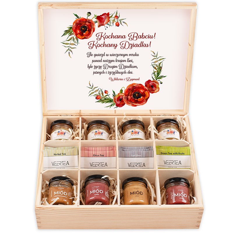 Drewniana skrzynka podzielona jest na 12 przegródek, a w każdej z nich umieściliśmy pyszne prezenciki dla Dziadków. Zestaw zawiera: cztery słoiczki miodków smakowych, cztery słoiczki klasycznych miodków i 12 saszetek z herbatkami o owocowych smakach (wysyłanych losowo). Przegródki wypełnione są ozdobną, naturalną ściółką Po otworzeniu skrzyni, po wewnętrznej stronie wieczka umieściliśmy ozdobną kartę z tekstem życzeń skierowanym do Babci i Dziadka, poniżej wpisu zamieścimy również Twoje imię.