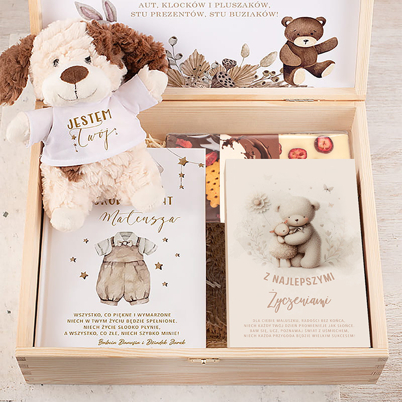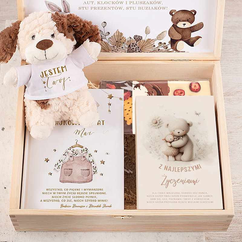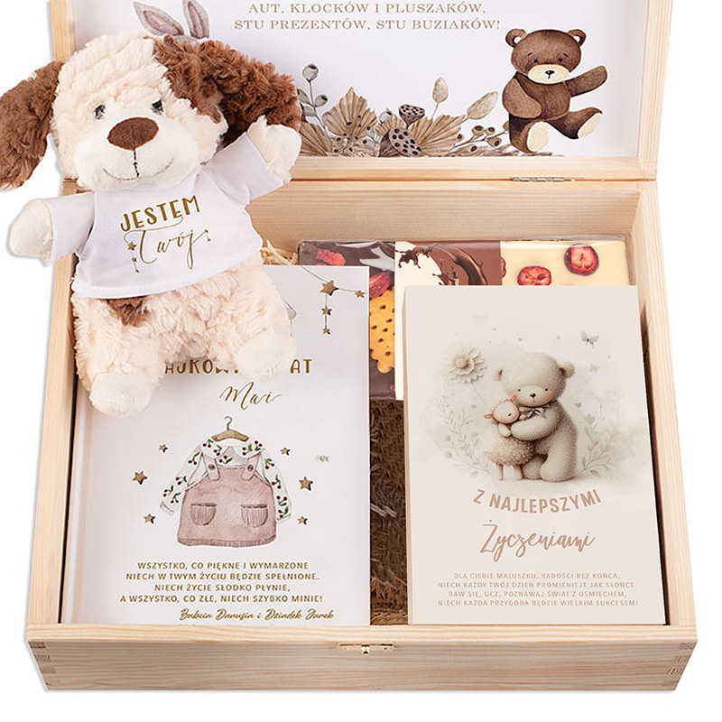 Jeśli szukasz wyjątkowego prezentu urodzinowego dla kilkulatka, skrzynka z prezentami dla dziecka idealnie się sprawdzi. Każdy maluch doceni taki upominek, a przede wszystkim będzie zaskoczony tak oryginalnymi komponentami zestawu. Warto nadmienić, że ten upominek ma w sobie walory nie tylko wizualne, ale także edukacyjne. Prezenty z zestawu przyniosą wiele radości dziecku. Książeczka rozbudzi wyobraźnię i będzie niesamowitą pozycją w domowej biblioteczce. Miś stanie się najlepszym przyjacielem. Sztućce sygnowane imieniem dla dziecka staną się ulubionym kompletem do jedzenia. Skrzynka z prezentami dla dziecka idealny jest na urodziny. Ze względu na możliwość doboru grafiki na okładce i grawera na wieczku zestaw sprawdzi się zarówno dla dziewczynki jak i dla chłopca.