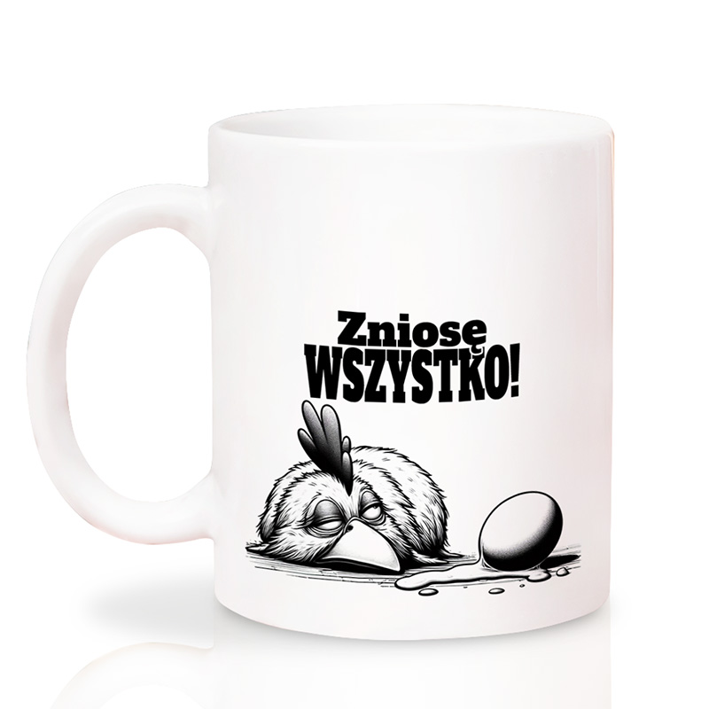Wygodny kubek świetnie sprawdza się podczas porannej kawy, herbaty w pracy czy wieczornego relaksu. Na kubku widnieje kura w towarzystwie jajek, co w połączeniu z napisem „zniosę wszystko” tworzy prosty, ale genialny żart słowny. Idealny dla osób, które mają dystans do siebie, do życia i do ilości obowiązków, które codziennie trzeba ogarnąć.