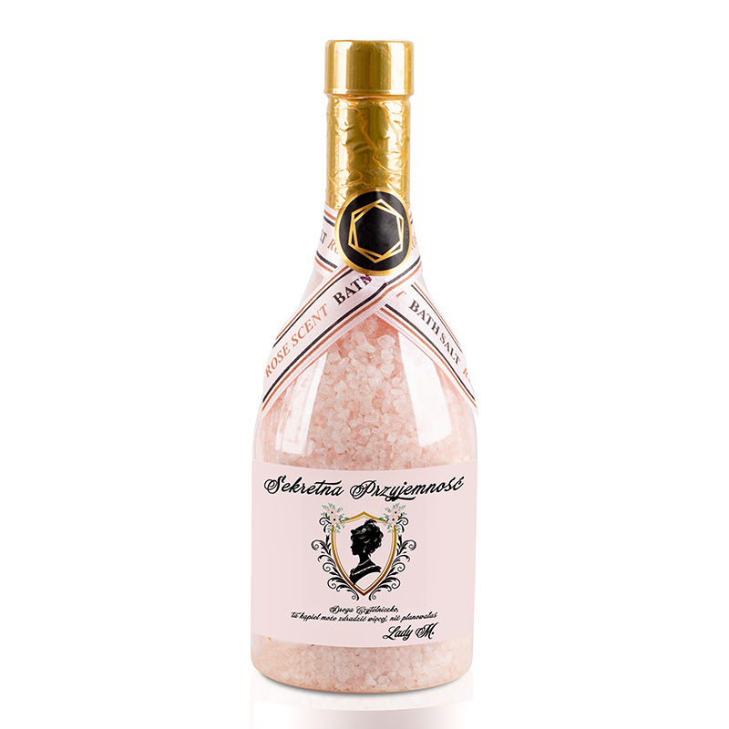 Sól do kąpieli znajduje się w oryginalnej butelce, która wygląda jak ta od szampana. Na etykiecie znajduje się stylowa ilustracja kobiecego profilu w klimacie retro, otoczona ozdobnym herbem i delikatnymi zdobieniami roślinnymi. Dodatkowo w górnej części znajduje się napis: “Sekretna Przyjemność”. Poniżej grafiki widnieje tekst: “Droga Czytelniczko, ta kąpiel może zdradzić więcej, niż planowałaś”.
