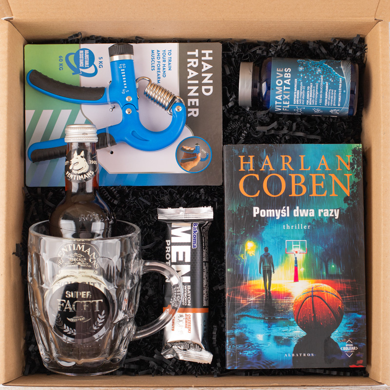 Gotowy prezent dla aktywnego fizycznie faceta, łączący akcesoria treningowe, batona proteinowego, colę, kufel „Super Facet” oraz książkę Harlana Cobena.