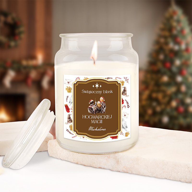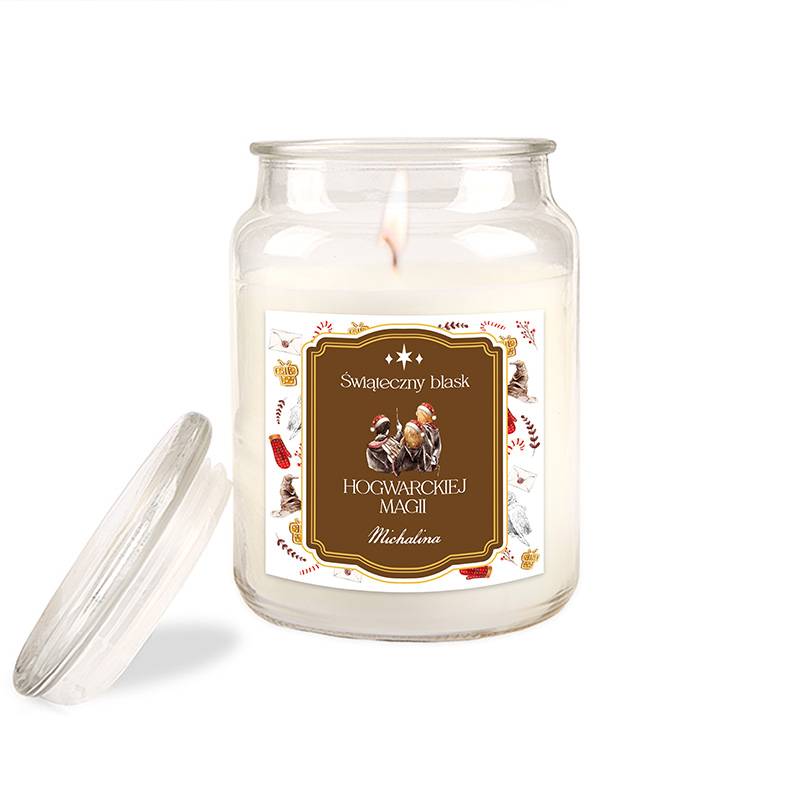 Świeca w szklanym, eleganckim słoiku z wieczkiem posiada ozdobną etykietę inspirowana światem magii. W centralnej części znajduje się grafika przedstawiająca trzy postacie w czapkach Świętego Mikołaja z różdżkami przywodzące na myśl młodych czarodziejów z Hogwartu. Całość opatrzona jest napisem: „Świąteczny blask Hogwarckiej Magii” oraz personalizacją imieniem, co sprawia, że świeca staje się jeszcze bardziej osobista i wyjątkowa.