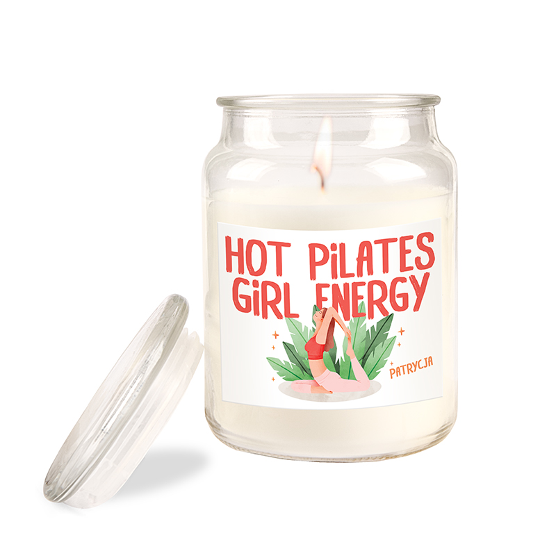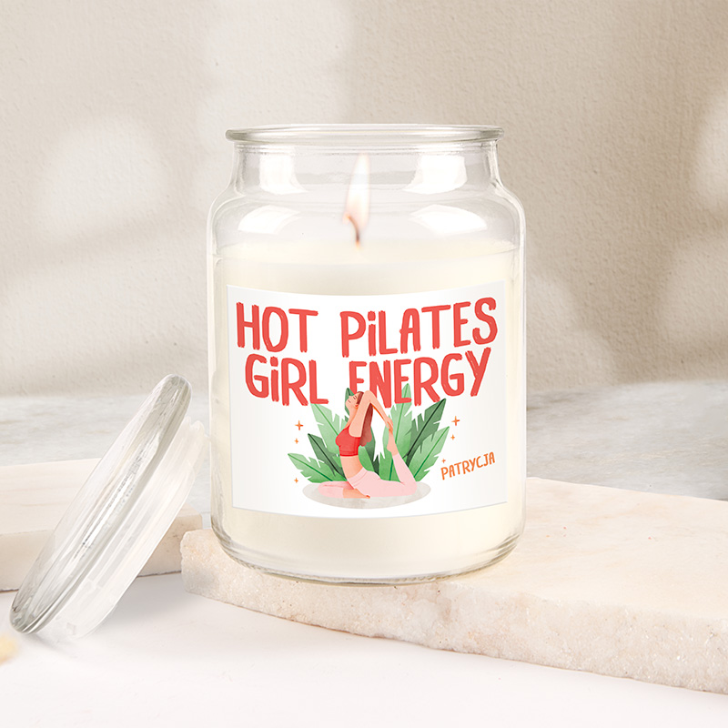 Świeca zapachowa jest w postaci szklanego słoika z wieczkiem. Na etykiecie widnieje dynamiczna grafika przedstawiająca kobietę w stroju do ćwiczeń w pozycji pilatesowej. Znajduje się ona na tle zielonych liści. W górnej części znajduje się tekst: “HOT PILATES GIRL ENERGY”. Duża i nowoczesna czcionka jest w intensywnym, czerwonym kolorze, dzięki temu przyciąga wzrok. Personalizacji podlega imię, które umieścimy w dolnej części etykiety.