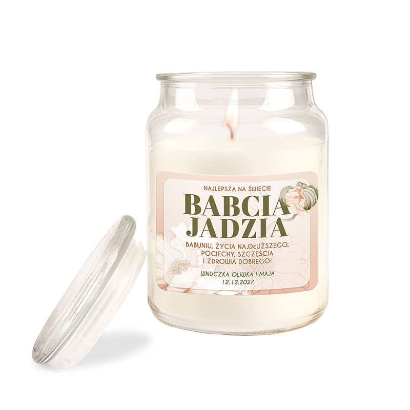 Świeca zapachowa w szklanym słoiku z napisem 'BABCIA JADZIA' oraz dedykacją: 'Babuluni, życia najdłuższego, pociechy, szczęścia i zdrowia dobrego!'. Słoik stoi na marmurowej podstawie, w tle widać delikatne kwiaty.