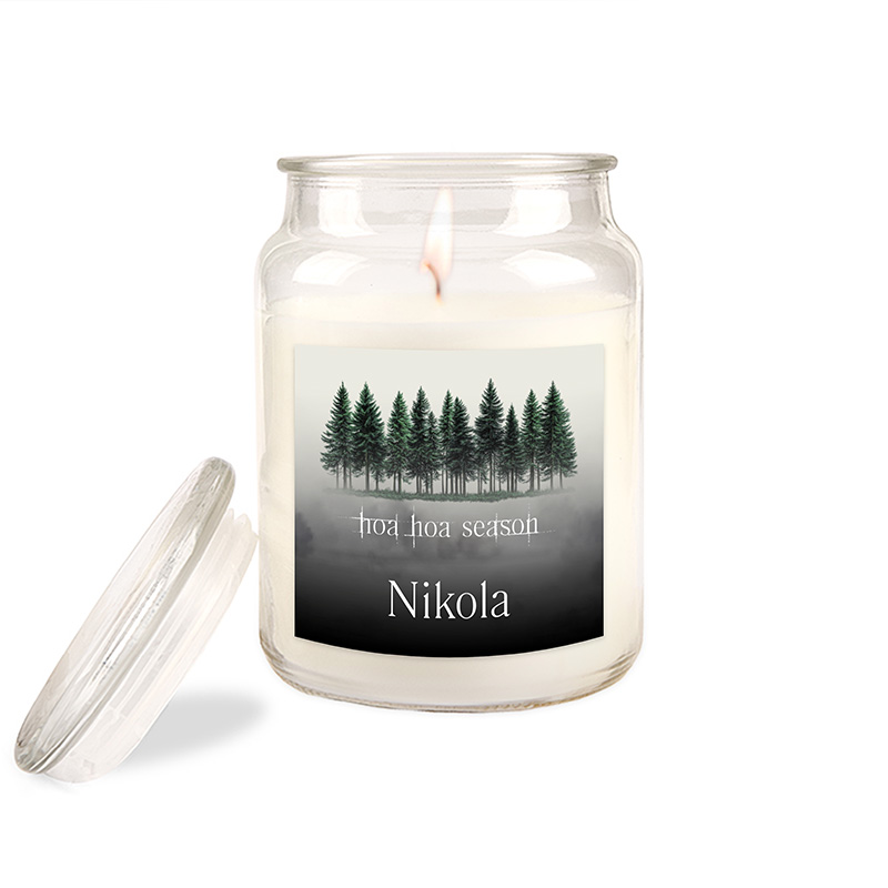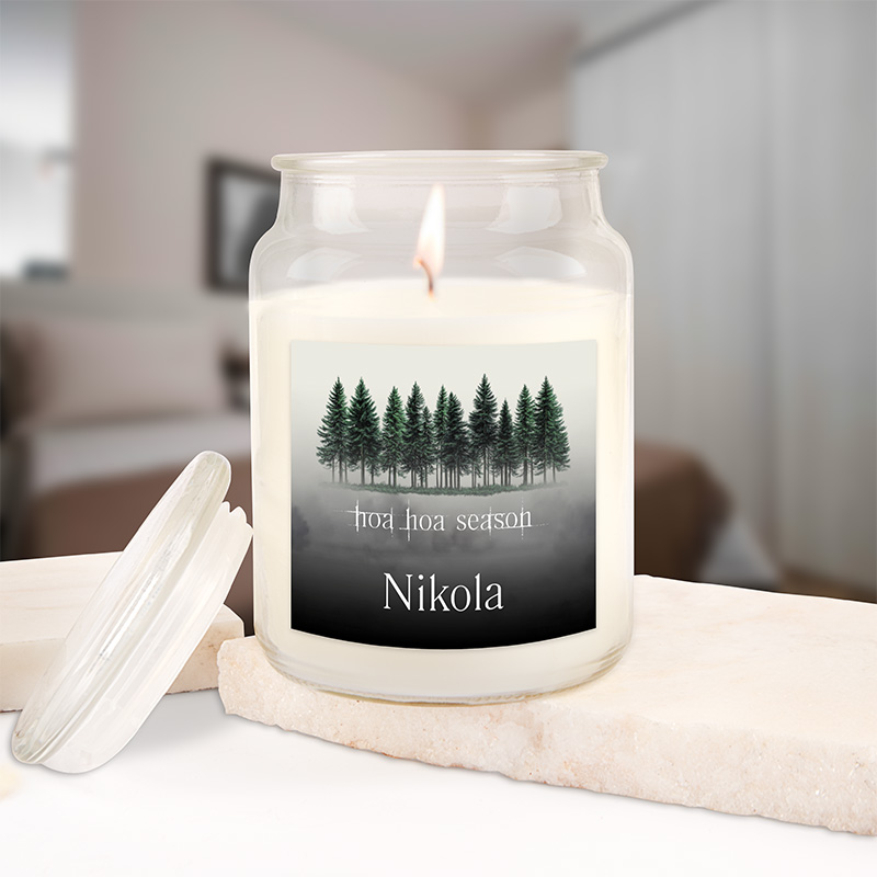 Szklany słoiczek z wieczkiem skrywa świeczkę o jasnym, kremowym kolorze i eleganckiej etykiecie przedstawiającej ciemny las. Napis „hoa hoa season” został umieszczony w centralnej części wzoru. Poniżej widnieje personalizowane imię.
