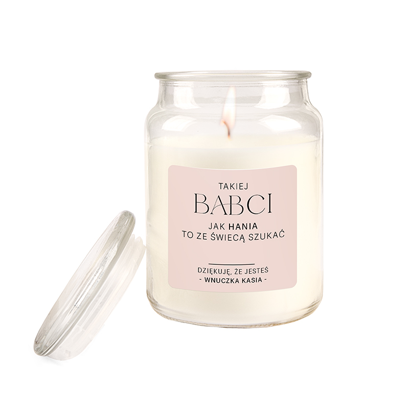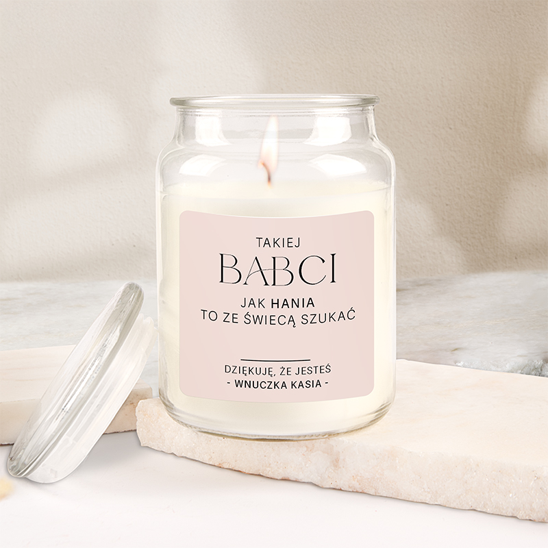Świeca znajduje się w szklanym słoiku, który idealnie komponuje się z każdym wnętrzem. Minimalistyczna, pastelowa etykieta dodaje elegancji, dzięki czemu pasuje do różnych aranżacji. Dodatkowo wosk gwarantuje długie i równomierne spalanie, co sprawia, że świeca będzie cieszyć babcię przez długi czas. Subtelny, kojący zapach wprowadza atmosferę relaksu, doskonałą do odpoczynku przy książce, filiżance herbaty lub ulubionym serialu. Na różowej etykiecie świecy widnieje wzruszający, a jednocześnie zabawny napis: „Takiej babci jak Ty to ze świecą szukać”. To niezwykły akcent, który wywoła uśmiech na jej twarzy i jednocześnie poruszy serce. Dzięki personalizacji możesz dodać imię babci oraz własną dedykację, co sprawi, że ten prezent stanie się jeszcze bardziej wyjątkowy. Każdy detal tej świecy podkreśla Twoją wdzięczność i miłość.