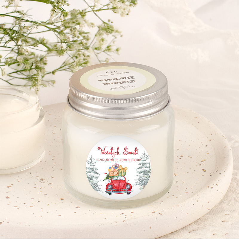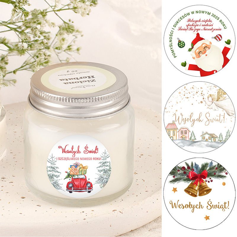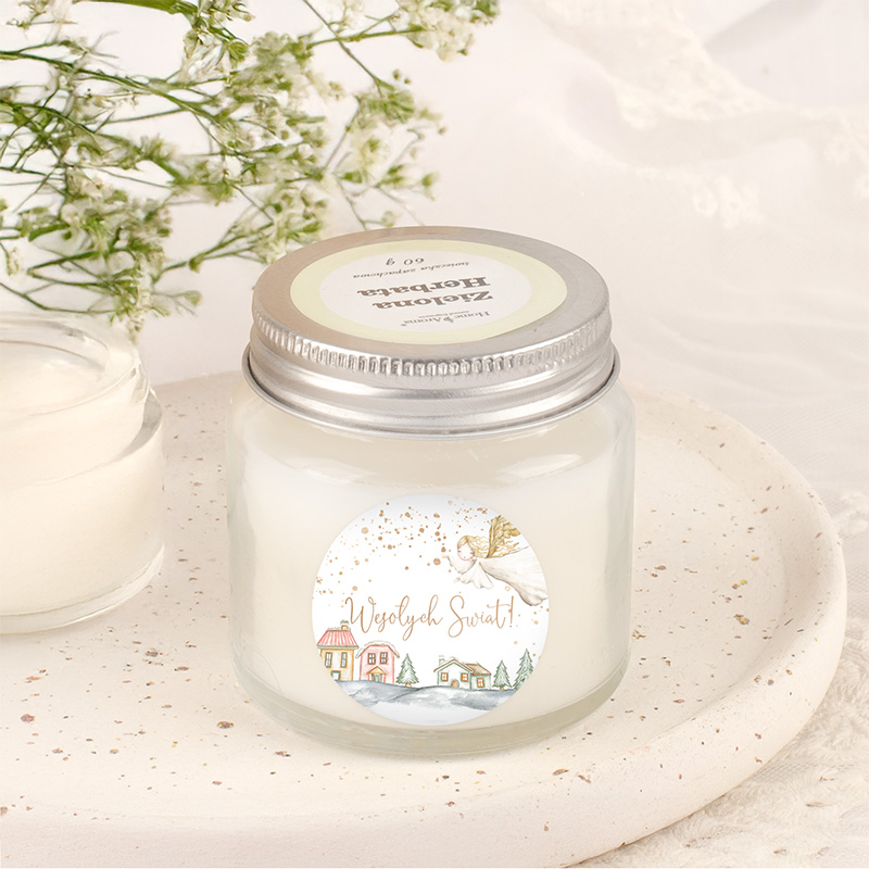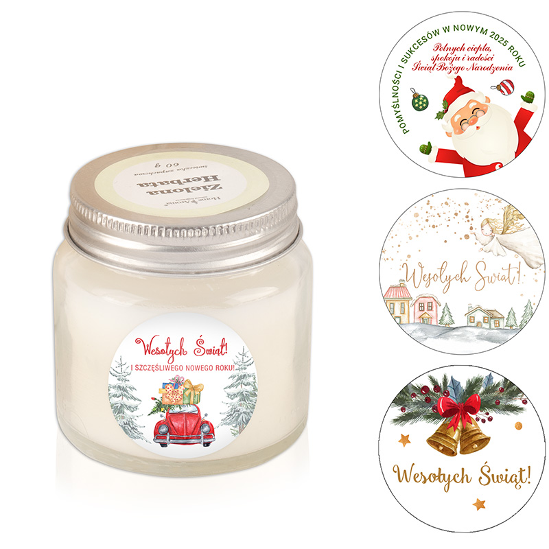 Świeczka znajduje się w szklanym słoiczku i nakrętką. Wewnątrz znajduje się jasny wosk, a na zewnętrznej stronie szkła umieścimy jedną z czterech dostępnych wersji etykiety świątecznej. Każda z wersji naklejek, które można wybrać, jest samoprzylepna i ma okrągły kształt. Wśród grafik bożonarodzeniowych na naklejkach znajdują się świąteczne pozdrowienia: Wesołych Świąt! Etykiety mają kolorowe grafiki, które jednoznacznie nawiązują do Świąt Bożego Narodzenia. Subtelny aniołek, który unosi się nad ośnieżonym miastem, stroik z dzwoneczkami, samochód wypchany prezentami oraz uśmiechnięty od ucha do ucha Mikołaj. Takie motywy znajdują się na poszczególnych etykietach, a Ty możesz wybrać swój, ten, który najbardziej przypadł Ci do gustu.