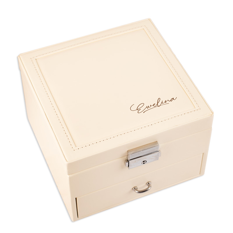 Szkatułka skórzana została wykonana z materiału w kolorze kremowym. Posiada wieczko z praktycznym zamknięciem na kluczyk oraz szufladkę z 9 przygórkami. Na górze szkatułki umieszczone jest imię. Personalizacja sprawia, że szkatułka na biżuterię z imieniem staje się niepowtarzalna i dopasowana do konkretnej osoby. Wnętrze szkatułki zostało zaprojektowane z myślą o wygodnej organizacji biżuterii. Znajdują się tam przegródki na pierścionki, kolczyki oraz bransoletki. Miękka wyściółka chroni biżuterię przed zarysowaniem, a dodatkowa szufladka zwiększa przestrzeń do przechowywania. W środku znalazło się także lusterko, które jest kolejnym praktycznym elementem kuferka na biżuterię.