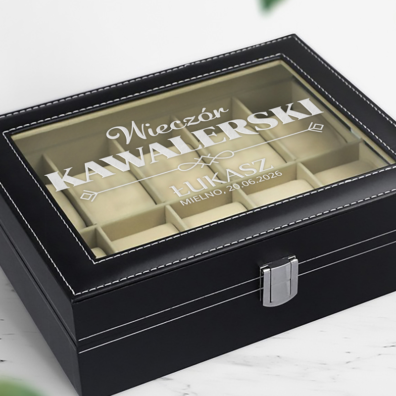 Personalizowana szkatułka na zegarki to elegancki prezent na wieczór kawalerski, utrzymany w czarnej kolorystyce z białymi przeszyciami. Dzięki 10 przegródkom z miękkimi poduszkami pozwala uporządkować kolekcję i chroni zegarki przed zarysowaniami.