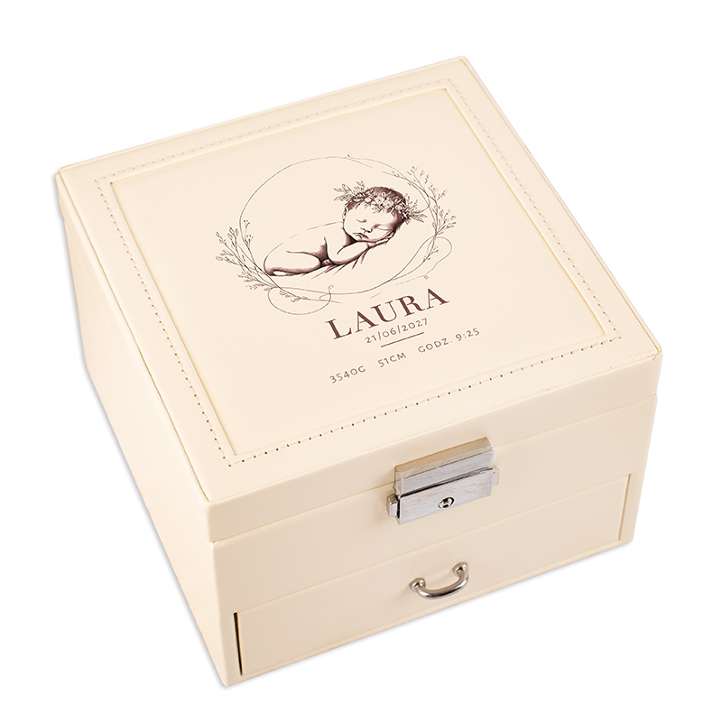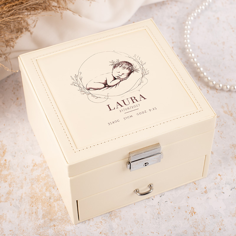 Szkatułka na biżuterię to wyjątkowy prezent na narodziny dla dziecka, który łączy estetykę z wartością sentymentalną. Jej kremowy kolor i subtelne detale czynią ją idealnym upominkiem dla nowo narodzonej dziewczynki. Została zaprojektowana z myślą o przechowywaniu pierwszych dziecięcych skarbów. Doskonale sprawdzi się na kolczyki, bransoletki lub inne pamiątki z dzieciństwa. Wieczko szkatułki zdobi ilustracja śpiącego niemowlęcia. Pod nią można umieścić imię dziecka oraz dane z dnia narodzin. Dzięki temu każda szkatułka zyskuje osobisty i niepowtarzalny charakter. To sprawia, że jest to nie tylko praktyczny, ale i symboliczny prezent na narodziny dla dziecka, który zachwyci rodziców i będzie cenną pamiątką.